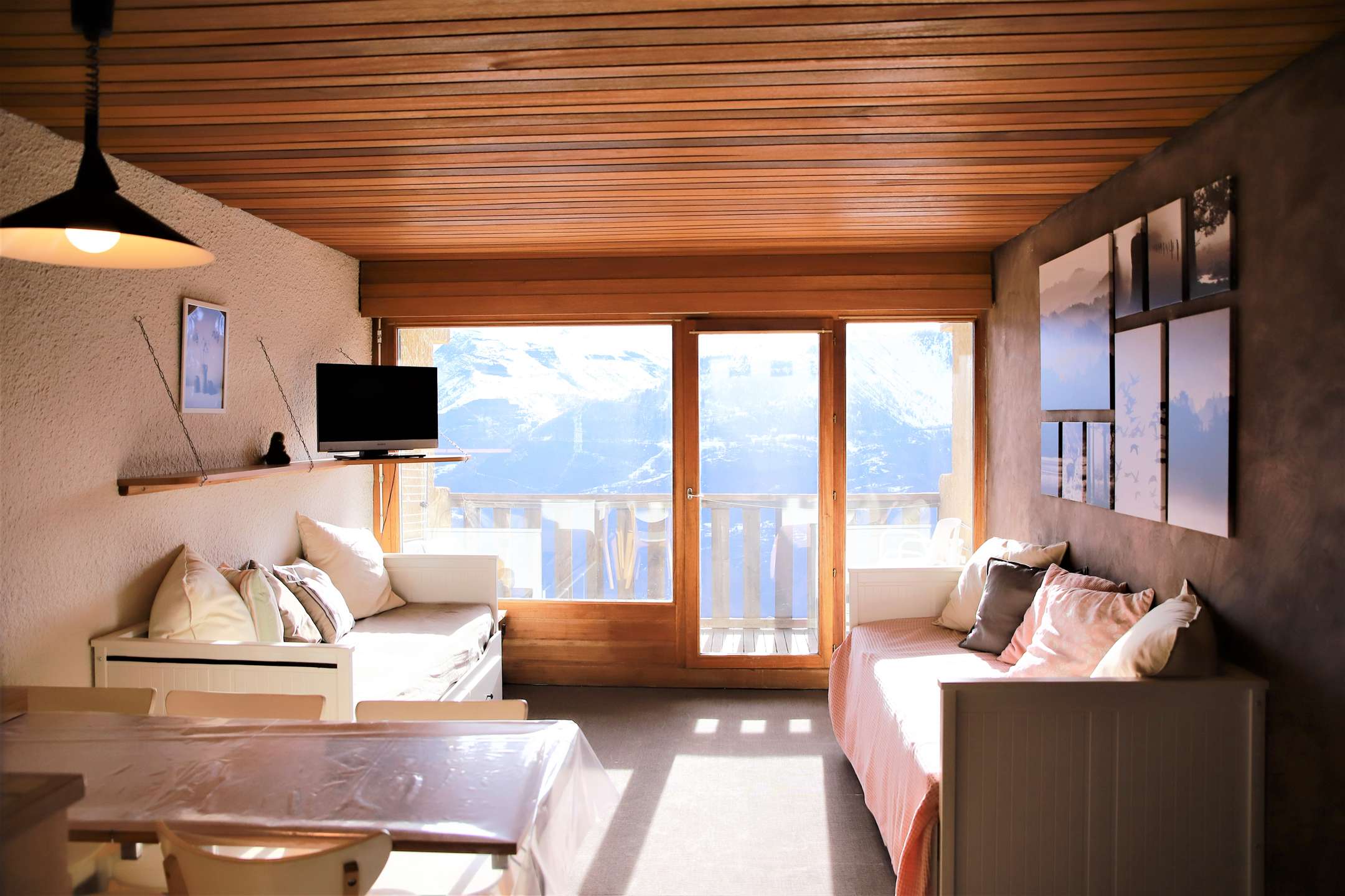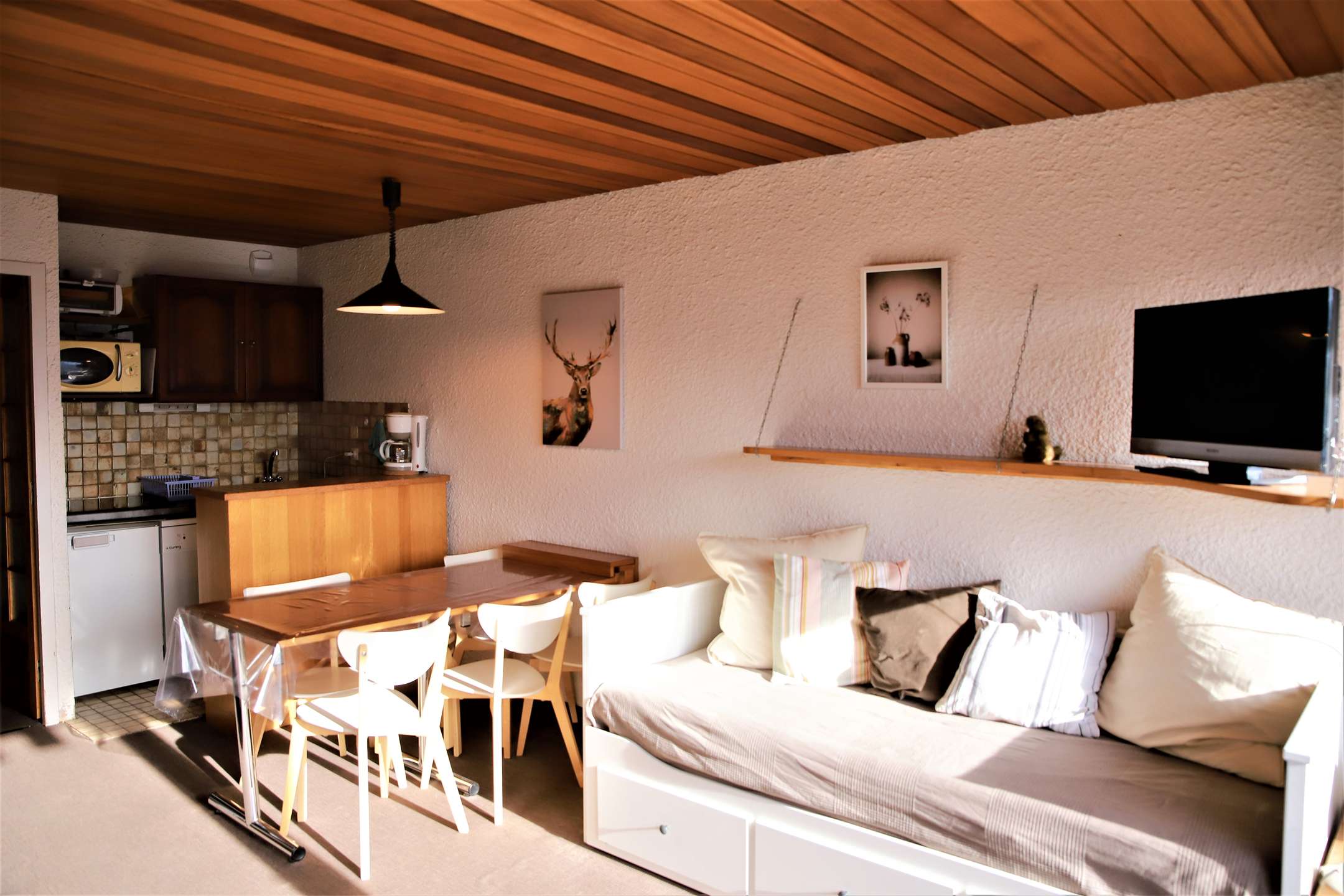 Large studio, spacious and functional, in a ski-in ski-out residence on a pedestrianized shopping area. Balcony with completely unobstructed view of the mountains.
