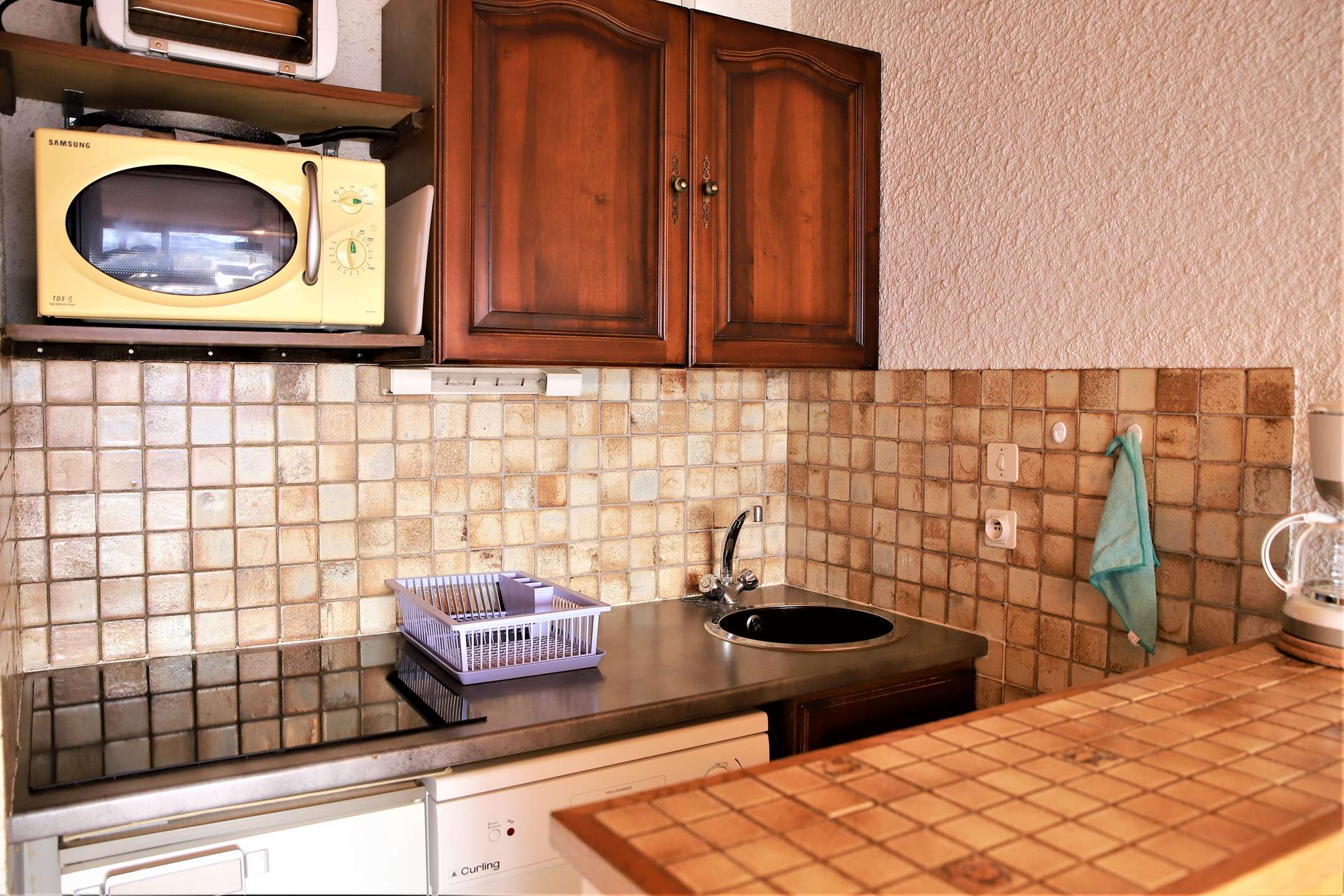 Equipped kitchenette: electric hobs,mini oven, microwave, fridge, bread toaster, kettle, coffee maker. TV set