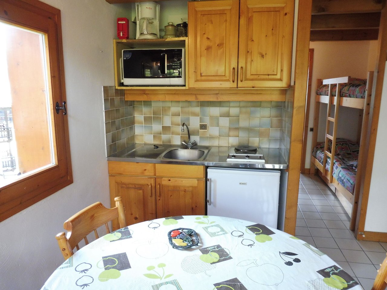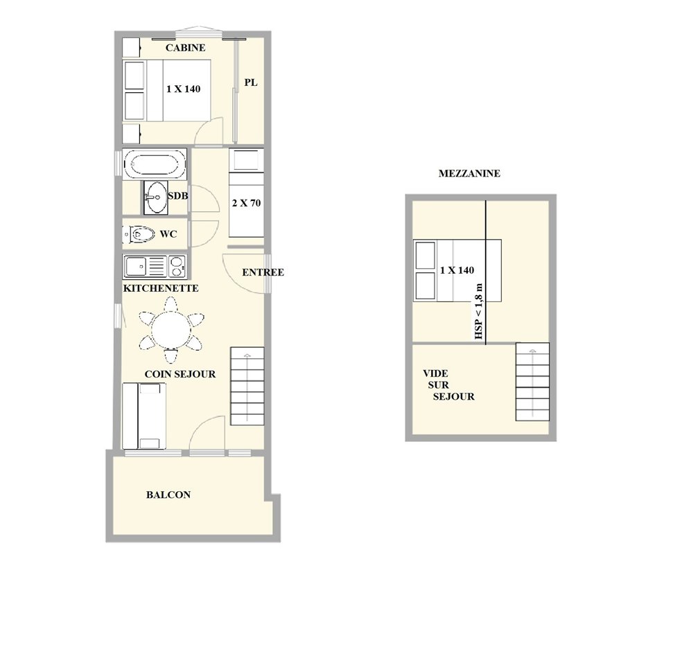 This 32 m² apartment is located on the first floor without a lift and comprises a living room, a kitchen open to the living room, a bedroom with a double bed, an alcove with 2 bunk beds (NB: the top bunk is not suitable for children under 6 years old), a bathroom, a separate toilet and a mezzanine with a double bed.