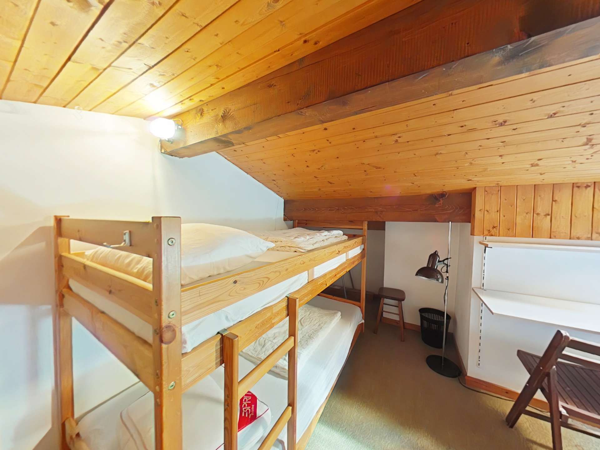 This 3rd-floor vacation apartment includes a living room with a comfortable sofa, television, and fireplace, a fully equipped kitchenette, a bedroom with a double bed, a mezzanine under the eaves (height 1.50m) with three single beds, a bathroom, and a separate toilet.