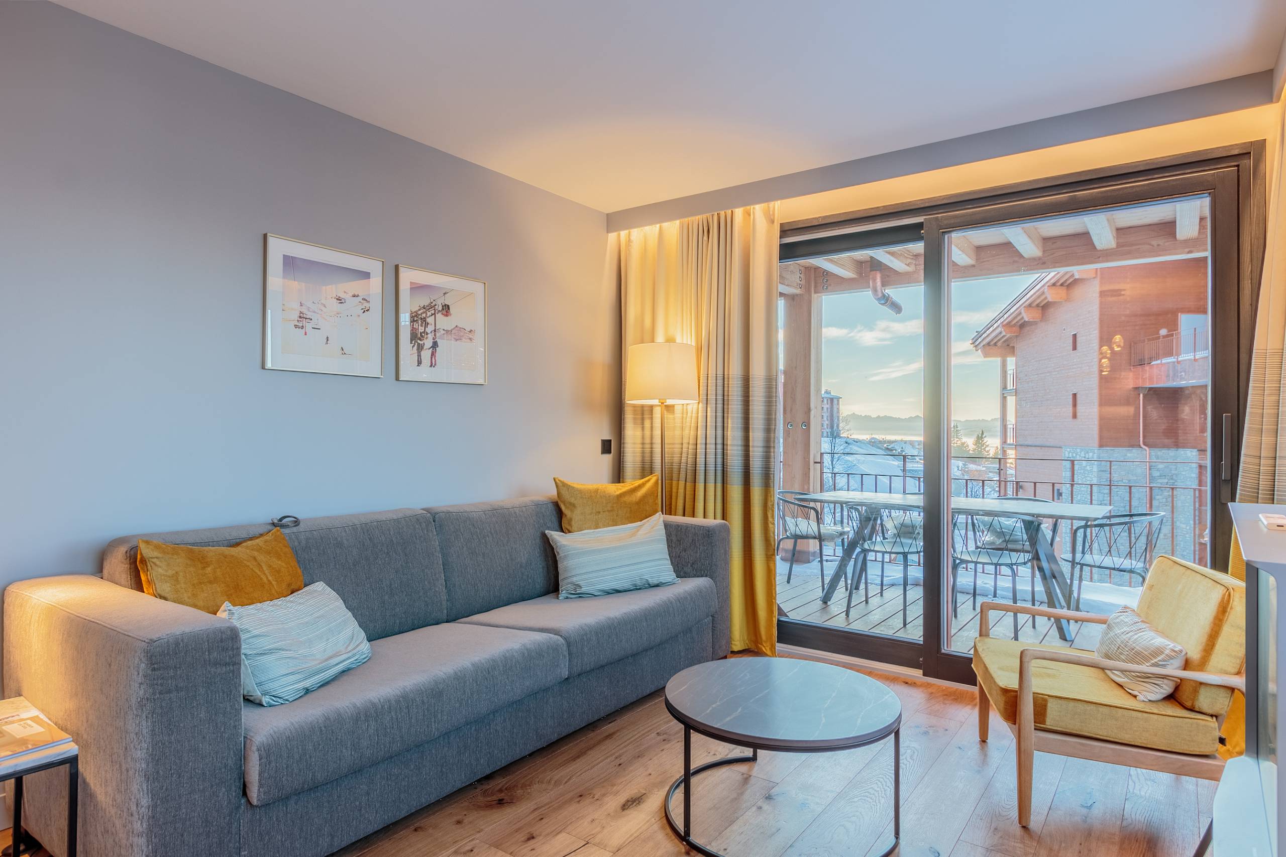 - Living room with terrace access: sofa, 2 armchairs, TV