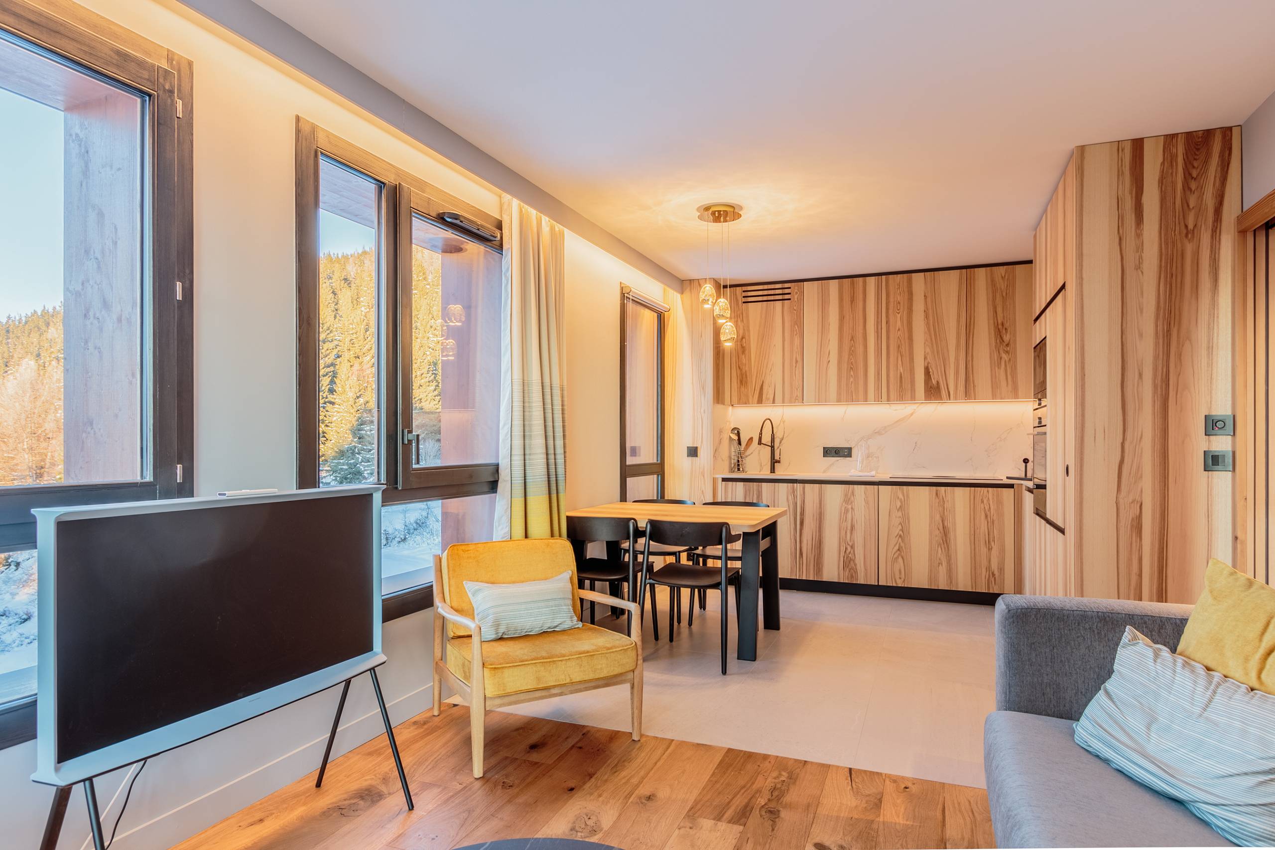 Located on the heights of Arc 1800, at Le Chantel, just a few minutes' walk from Edenarc and its services: Spa Nama Springs, gourmet grocery shop, ski hire shop, Voga Goga restaurant and the departure of the Dahu cable car, which links Edenarc to the snow front and the centre of Arc 1800 in less than 3 minutes.