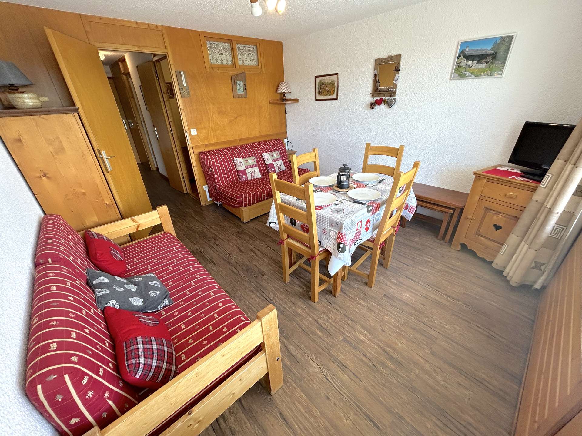 The apartment has a fully-equipped kitchenette, a living room with a BZ 140 sofa bed, a cabin with 2x80 bunk beds and a bathroom with separate toilet (N.B: the top bunk is not suitable for children under 6). There is an extra sofa but too small for someone to sleep on.