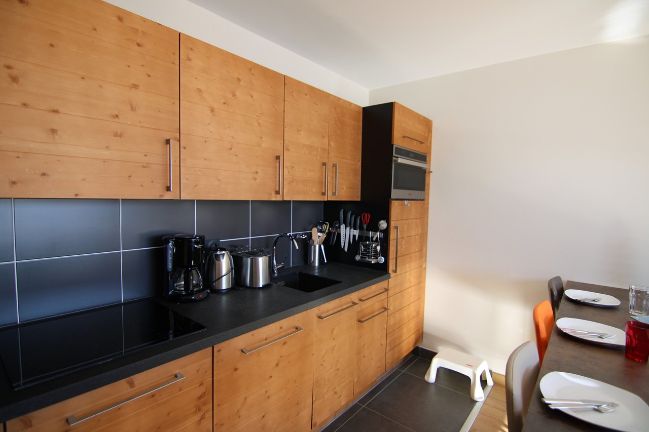 The apartment has a fitted kitchen, a living room with a sofa bed (140cm), a bedroom with bunk beds (2x80cm), a second bedroom with two beds (80cm) side by side, and a third bedroom with a bed (160cm), a bathroom, a shower room and a separate toilet.