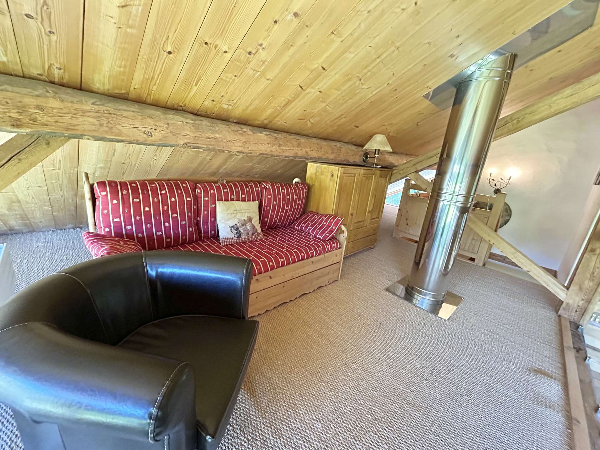First floor: a mezzanine overlooking the living room with a "BZ" style sofa and an attic bedroom with 1 double bed (140 x 200) - Television and 1 en-suite bathroom/wc.