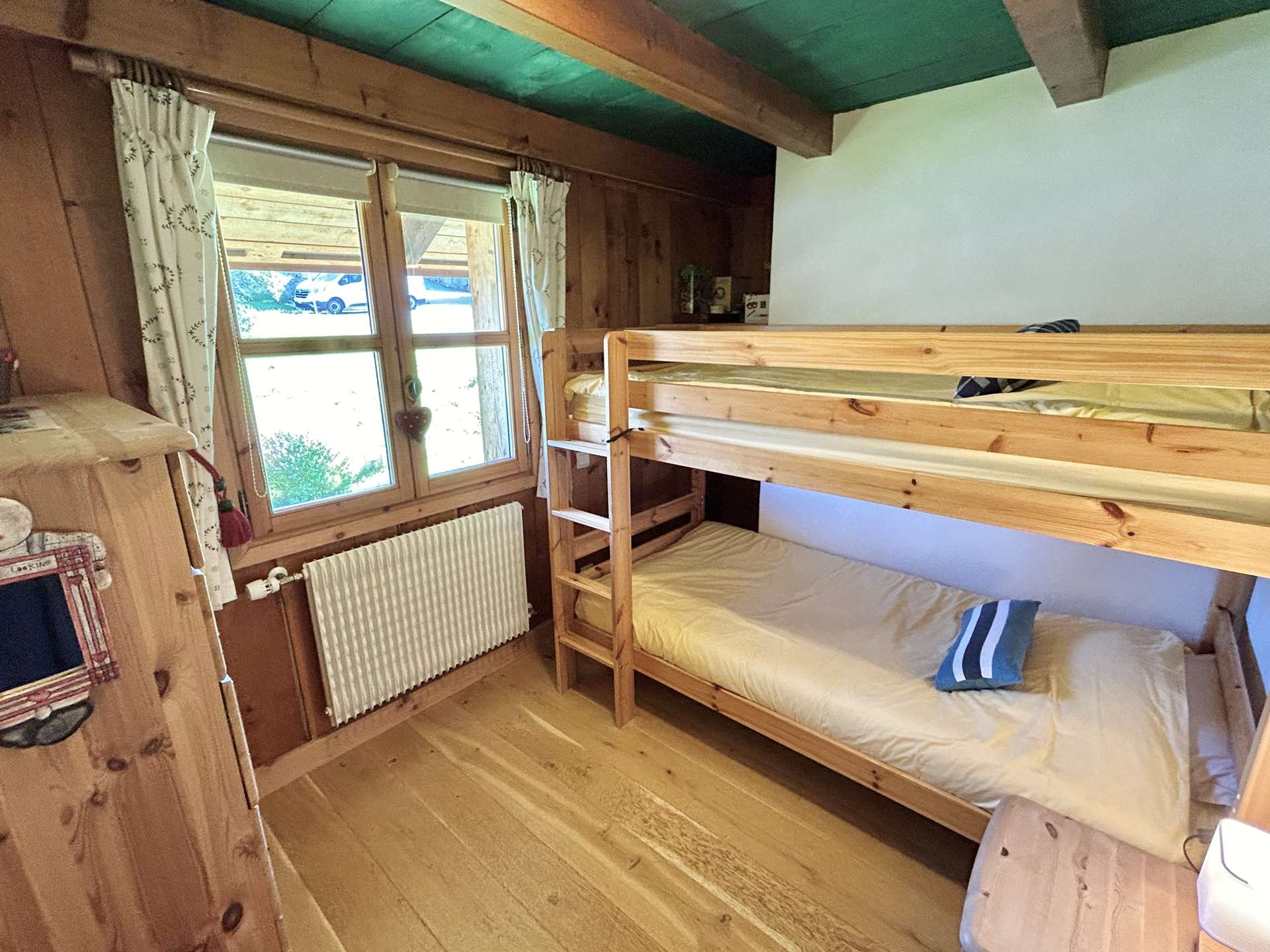 This apartment is on the 1st floor of a detached chalet and has an entrance hall with cupboards and wardrobe, a separate WC with washbasin, a bedroom with 2 bunk beds (90 x 190) and cupboard, a bathroom with washing machine and dryer, a bedroom with 1 double bed (160 x 190) and cupboard, a living room with fireplace (non-functional), television and access to the South-facing terrace, and a fully-equipped open-plan kitchen.