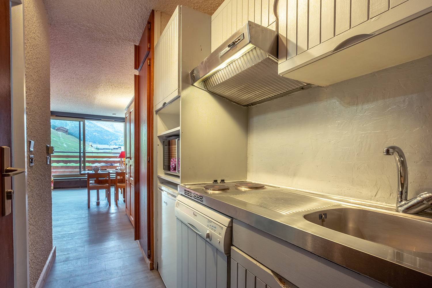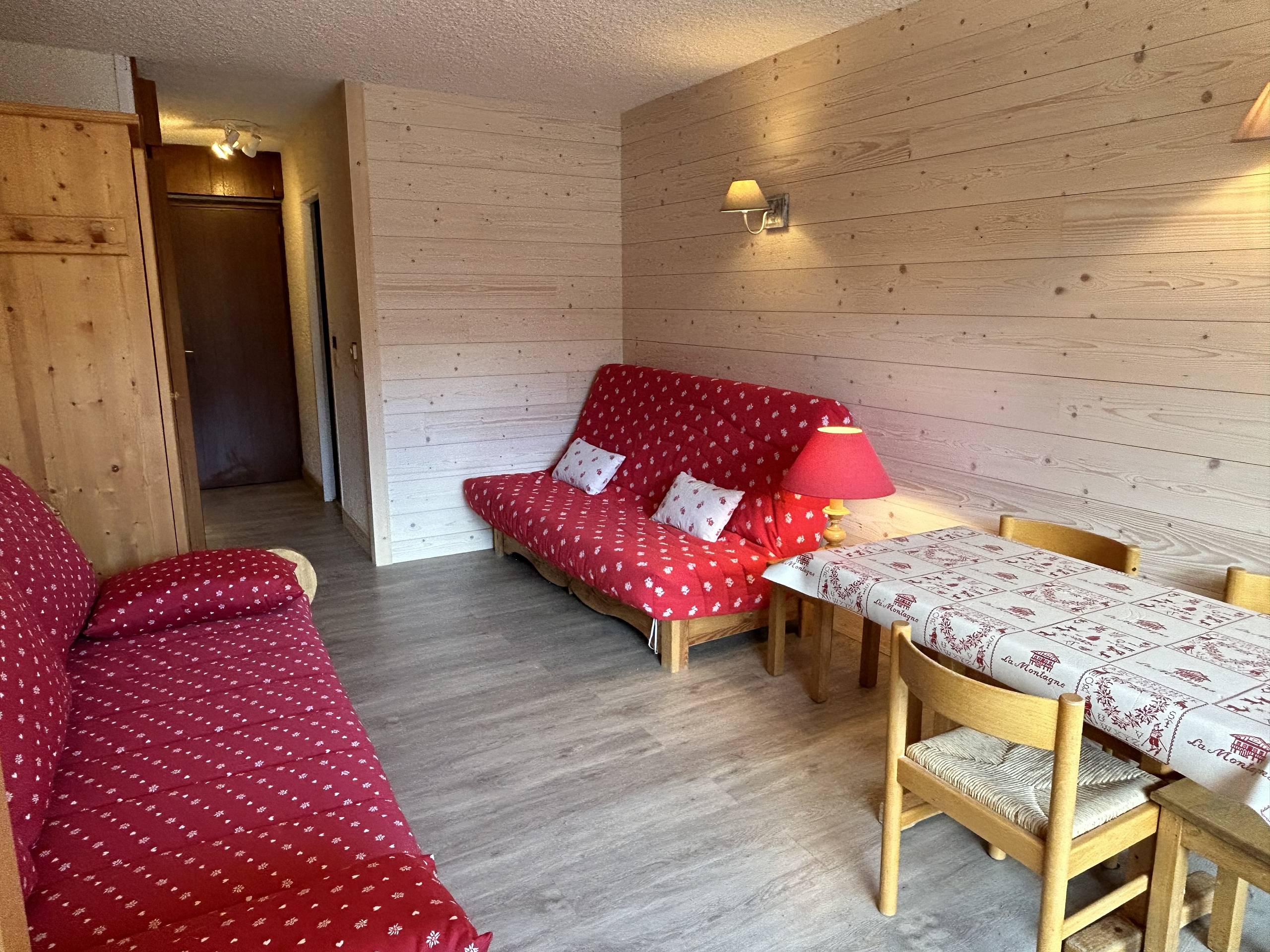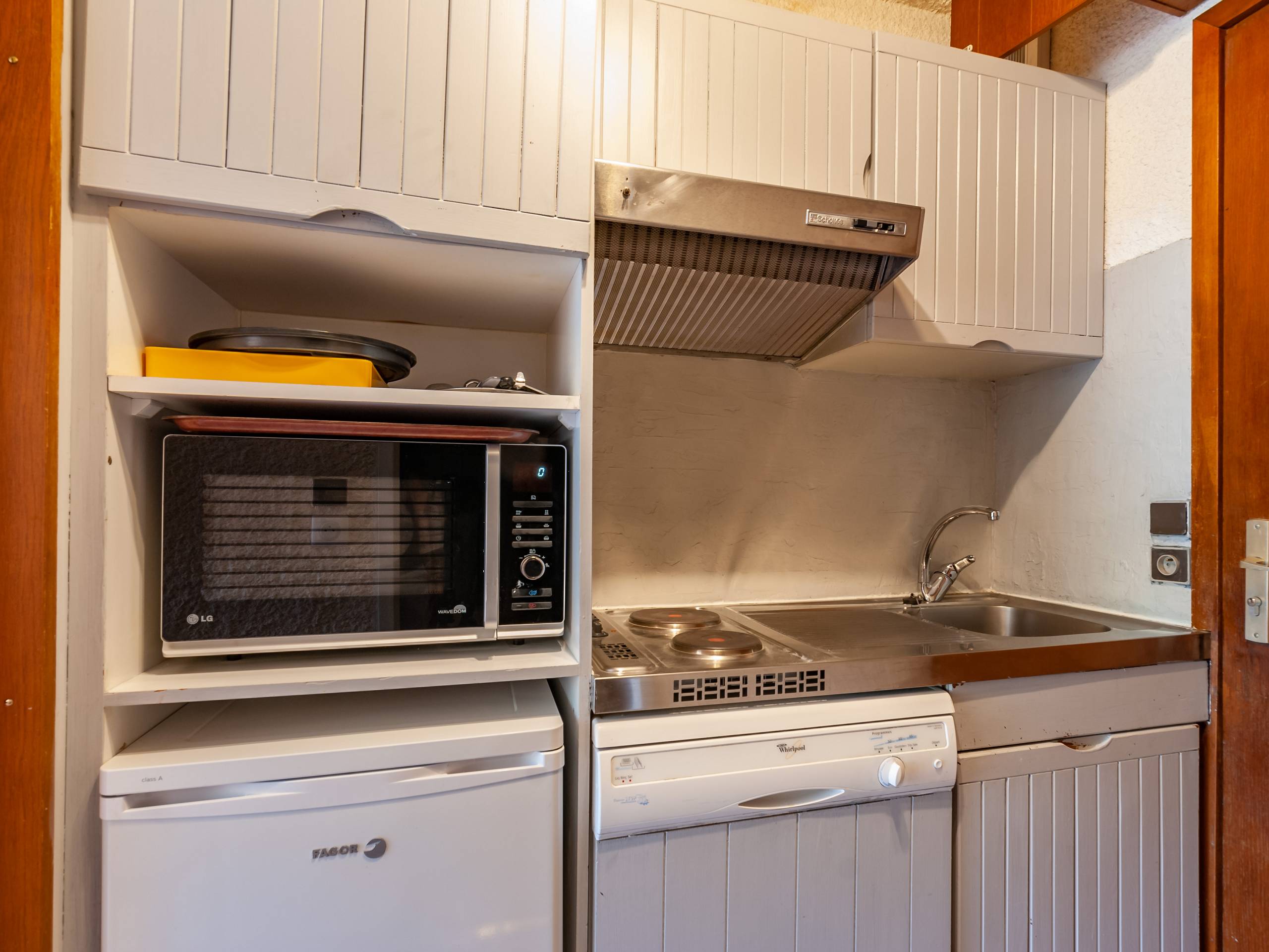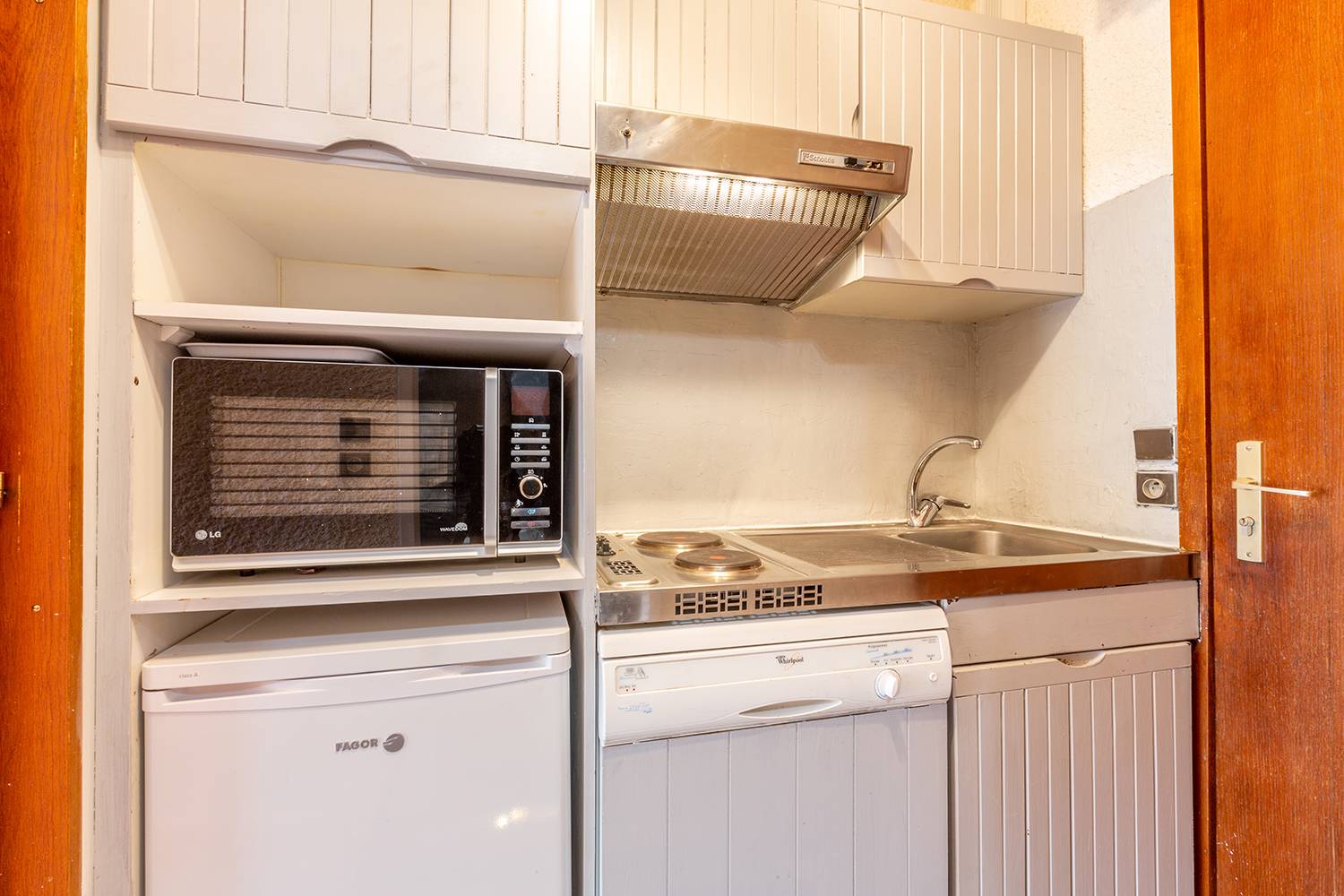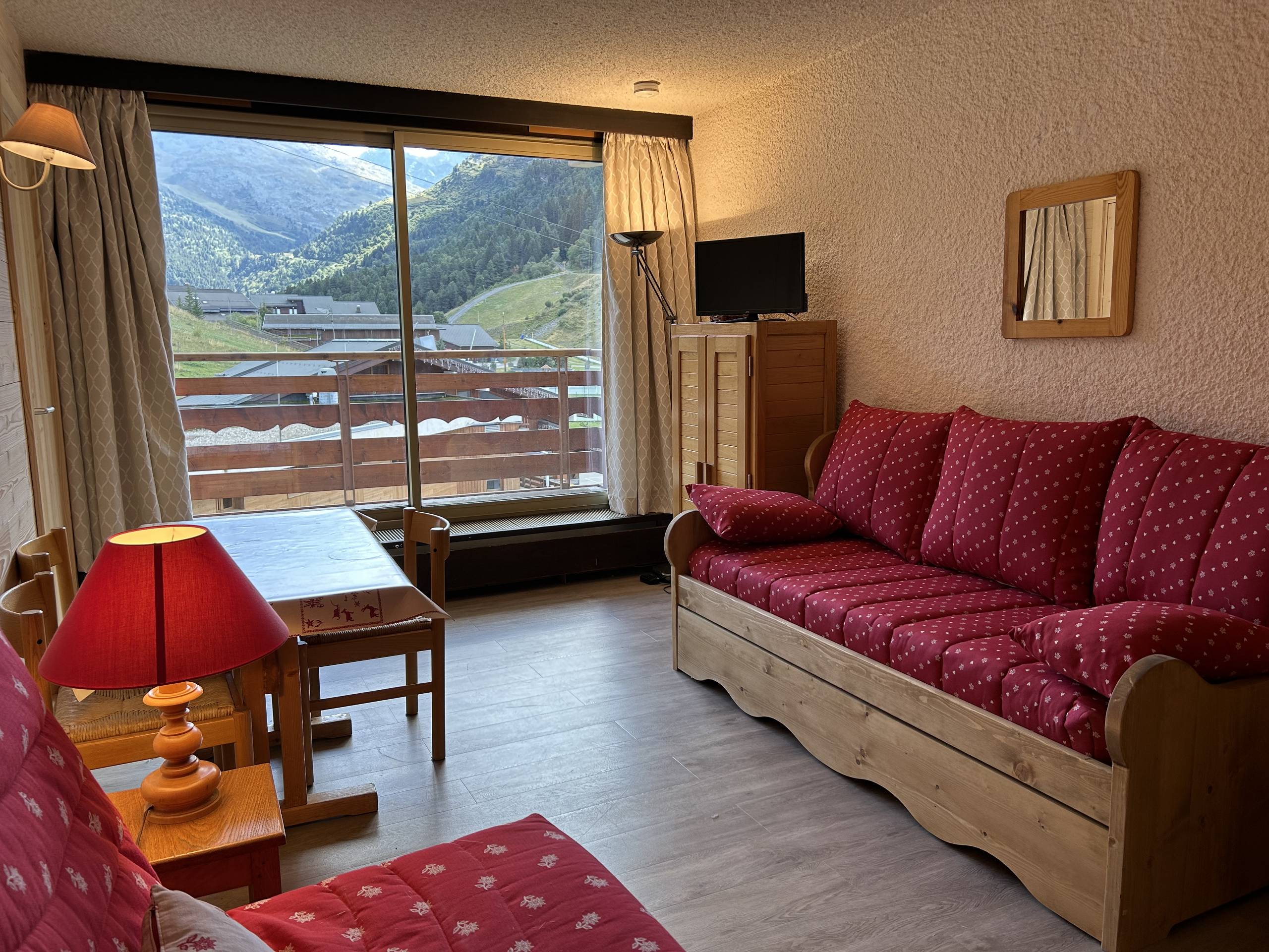 Living room with a sofa bed, a trundle bed and a sofa bed, television. Equipped with hob, microwave, dishwasher and refrigerator. Bathroom with toilet. South facing balcony. Non-smoking apartment. Ski locker and a lift in the residence. Pets forbidden.
