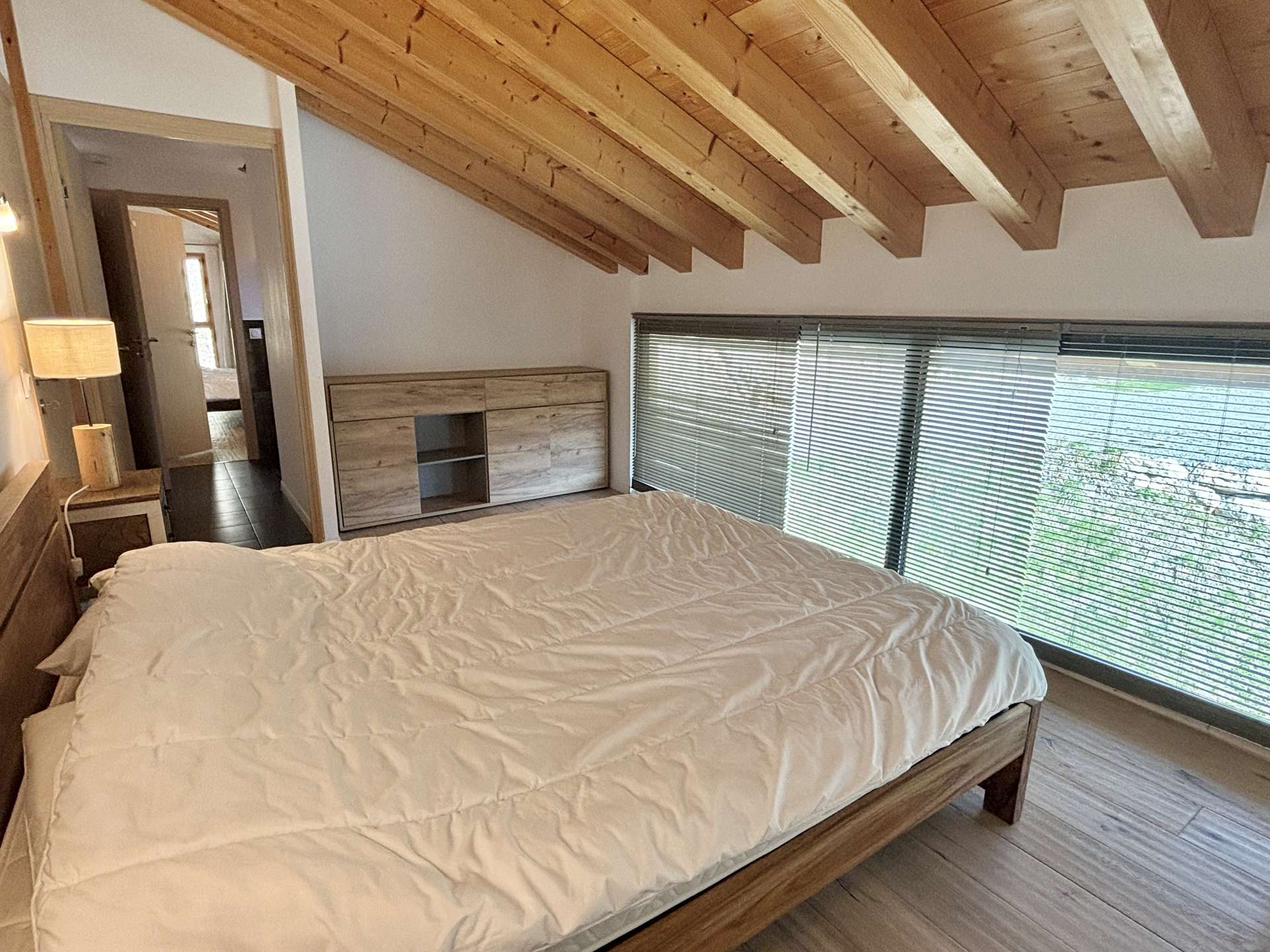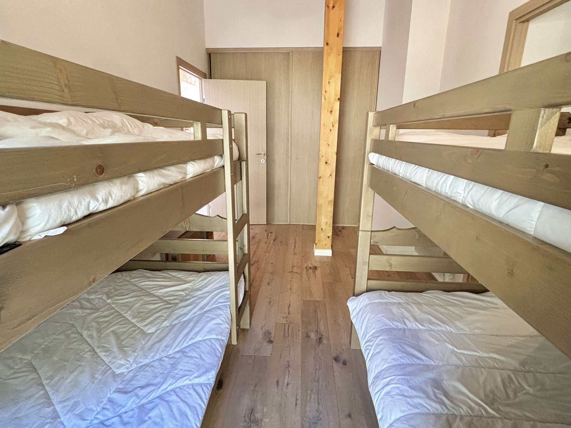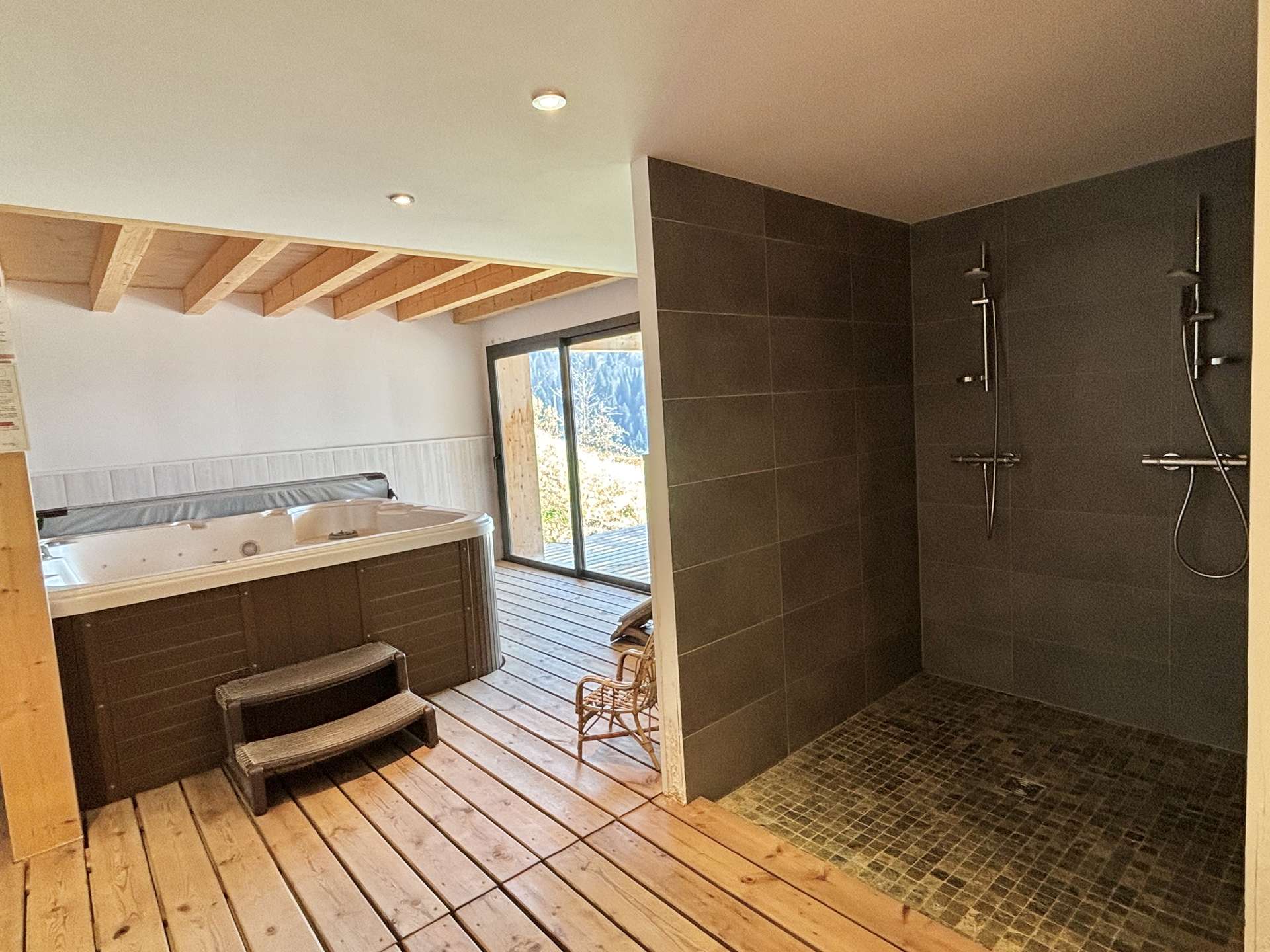 On the first floor there is a large, bright living/dining area with large windows, a wood-burning stove, a fully-equipped open-plan kitchen, a first bedroom with a double bed and forest views, a second bedroom with a double bed and forest views, a third bedroom with 1 double bed and a dressing room and forest views, a fourth bedroom with 2x2 bunk beds and forest views (NB: the upper bunk bed is not suitable for under 6s), a fifth bedroom with a double bed and dressing room and mountain views, a sixth bedroom with a double bed and mountain views and a mezzanine with a sofa bed for 1 person. The chalet has three shower rooms, a bathroom and 4 separate WCs.