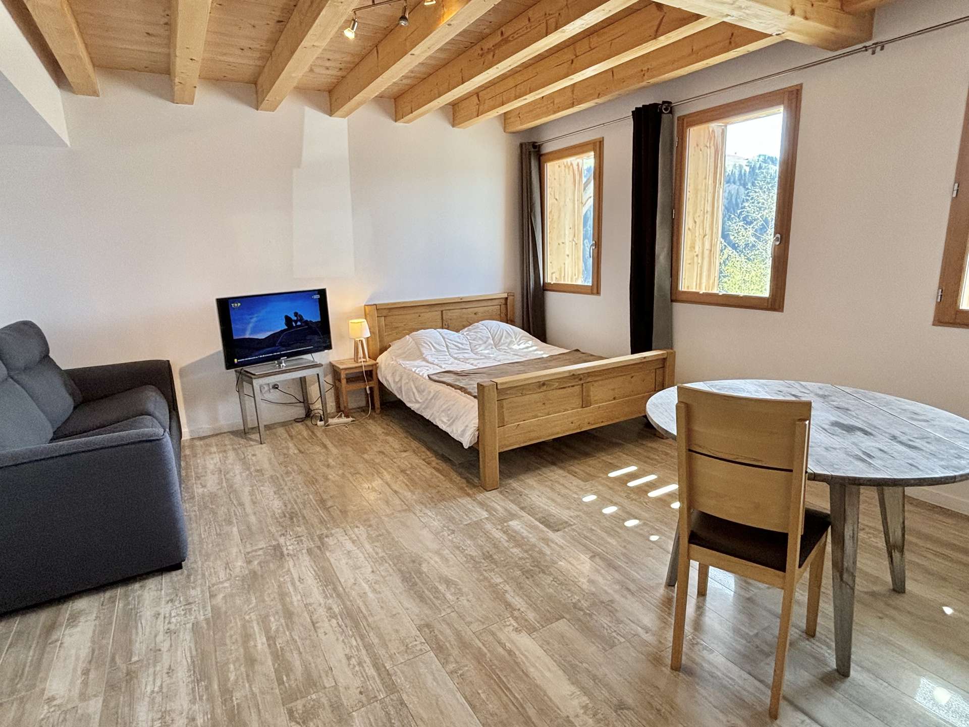 This chalet is located around 800 metres from the centre of Notre-Dame-de-Bellecombe, the ESF and the shops. There is WIFI access and three outdoor parking spaces in front of the chalet.