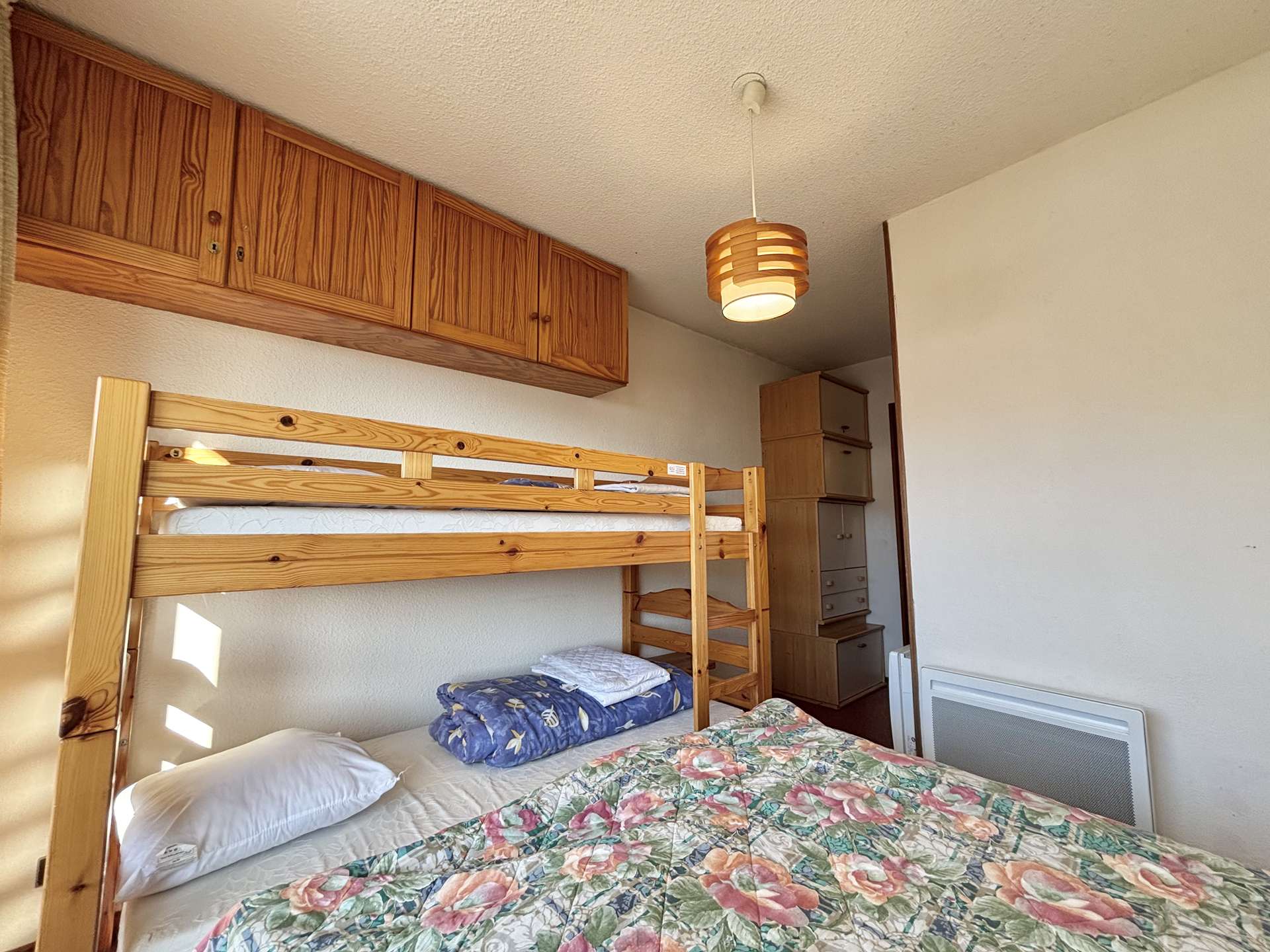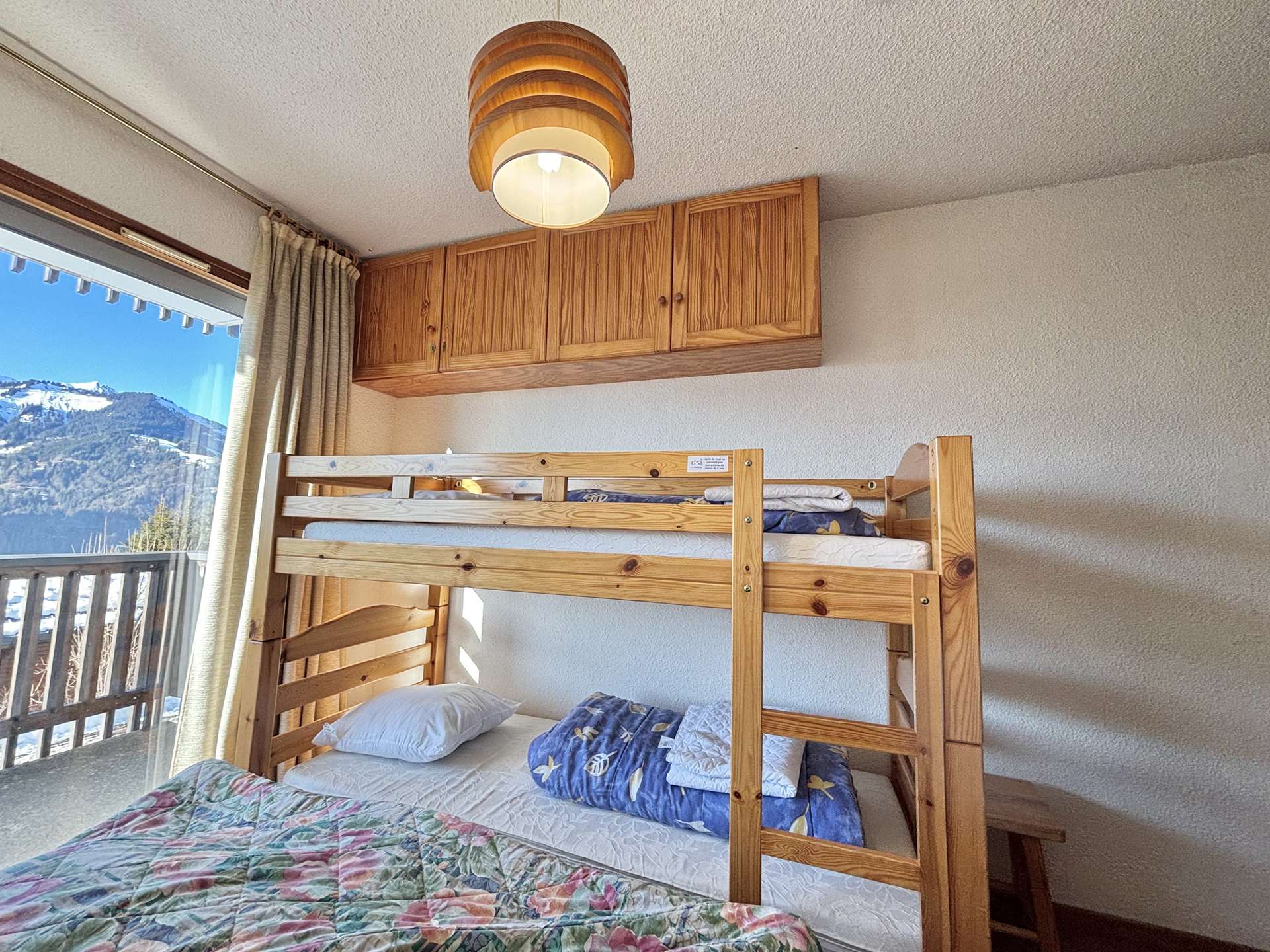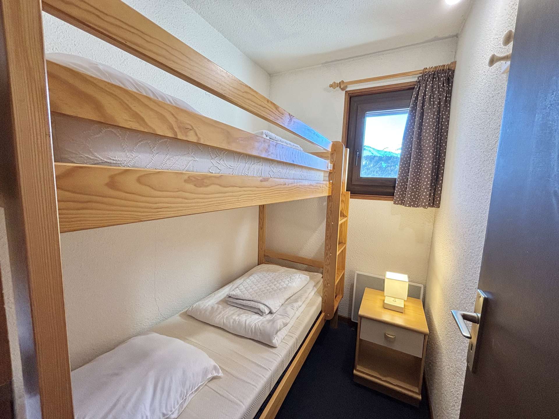 This 49 m² vacation apartment is located on the first floor with elevator access and consists of a cabin bedroom with two bunk beds, a bedroom with a double bed and two bunk beds (NB: Children under 6 are not allowed to sleep in the top bunk), a bathroom, a shower room, separate toilet, open-plan kitchen, living room with double sofa bed and access to a large corner balcony overlooking the mountains.