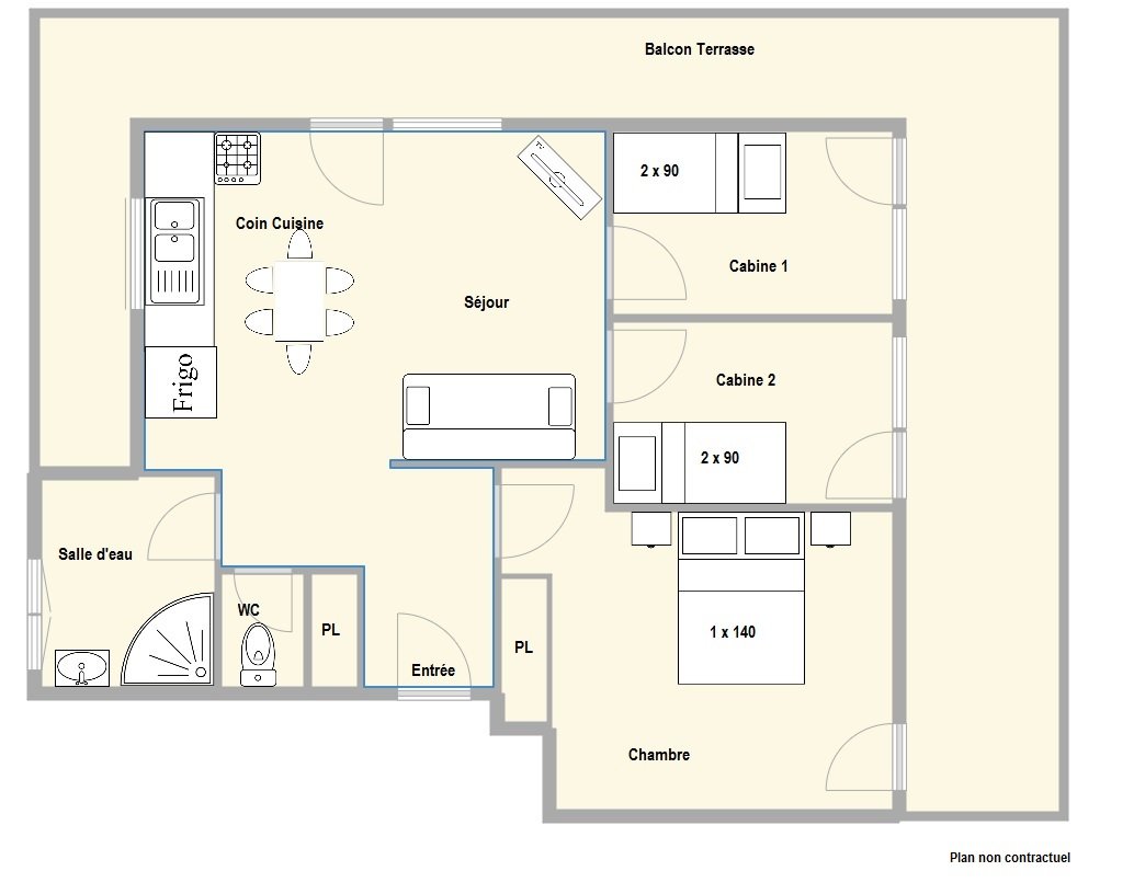 Cet appartement de vacances d'une superficie de 55 m² situé au deuxième étage sans ascenseur comprend une chambre avec un lit double, un séjour avec cuisine, deux chambres (inf. à 9m²) avec 2 lits superposés (NB : le lit supérieur d'un lit superposé est interdit aux - de 6 ans) dans chaque chambre, des WC indépendants et une salle d'eau.