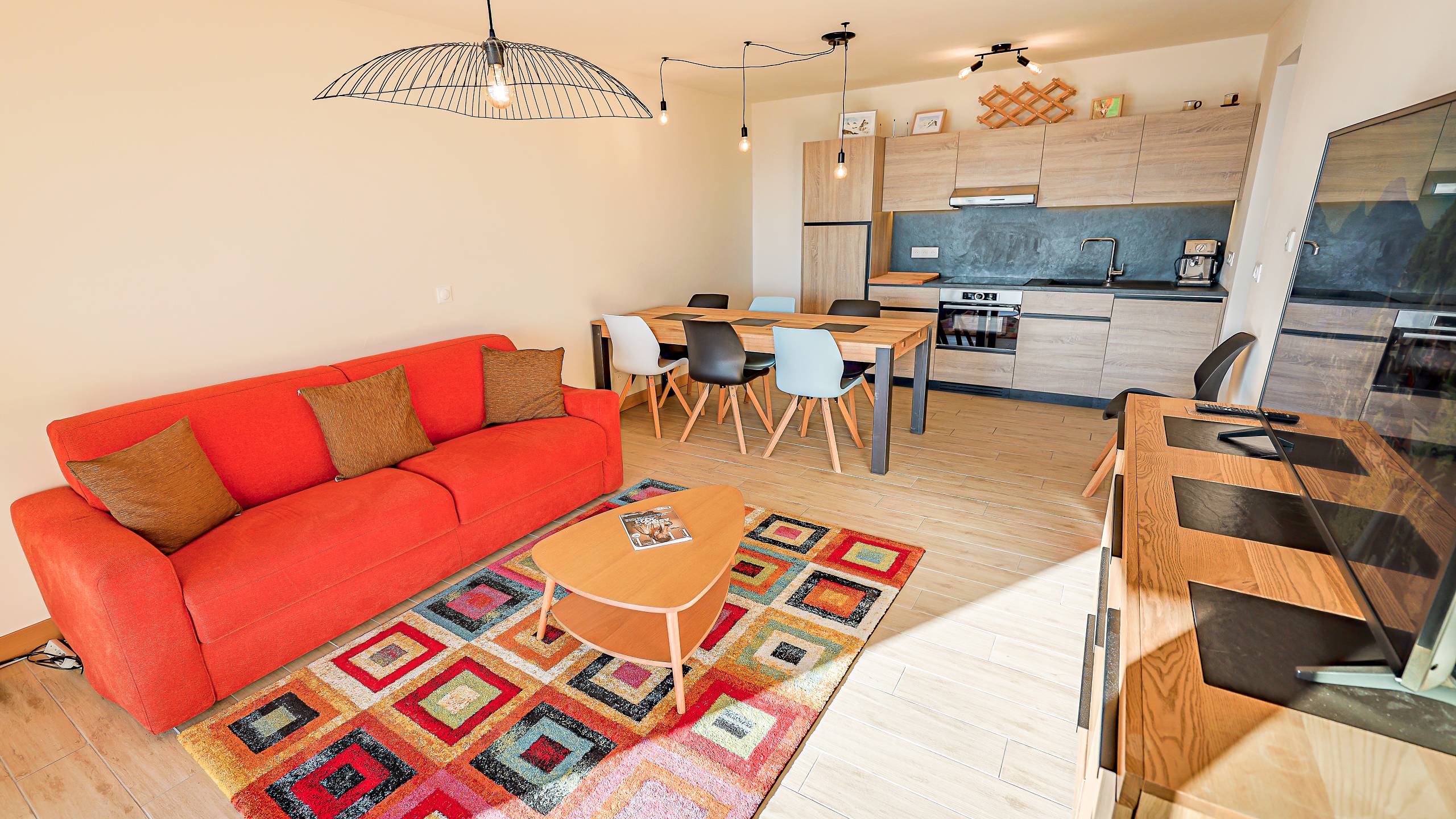 - 1 grand séjour comprenant 1 canapé, une TV grand écran 65 pouces et une grande terrasse de 12 m2