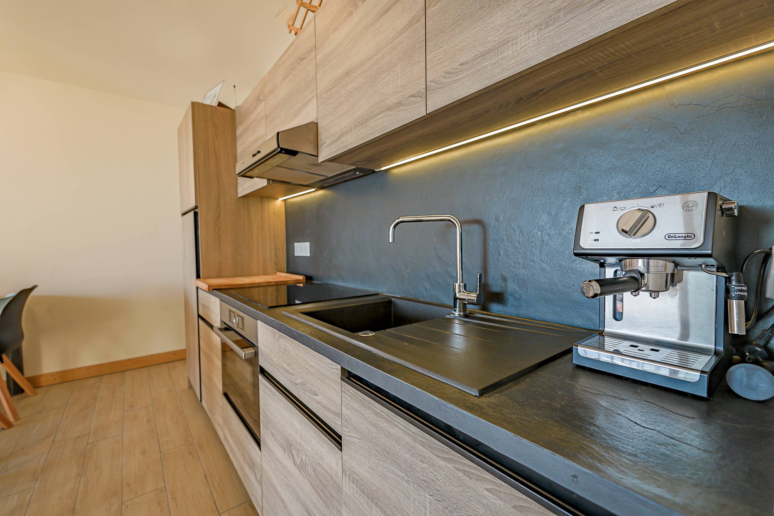 - 1 cuisine ouverte sur le séjour avec réfrigérateur, lave-vaisselle, four, micro-ondes, plaque induction, cafetière De'Longhi (capsule ESE), grille-pain, appareil à raclette et à fondue, bouilloire
