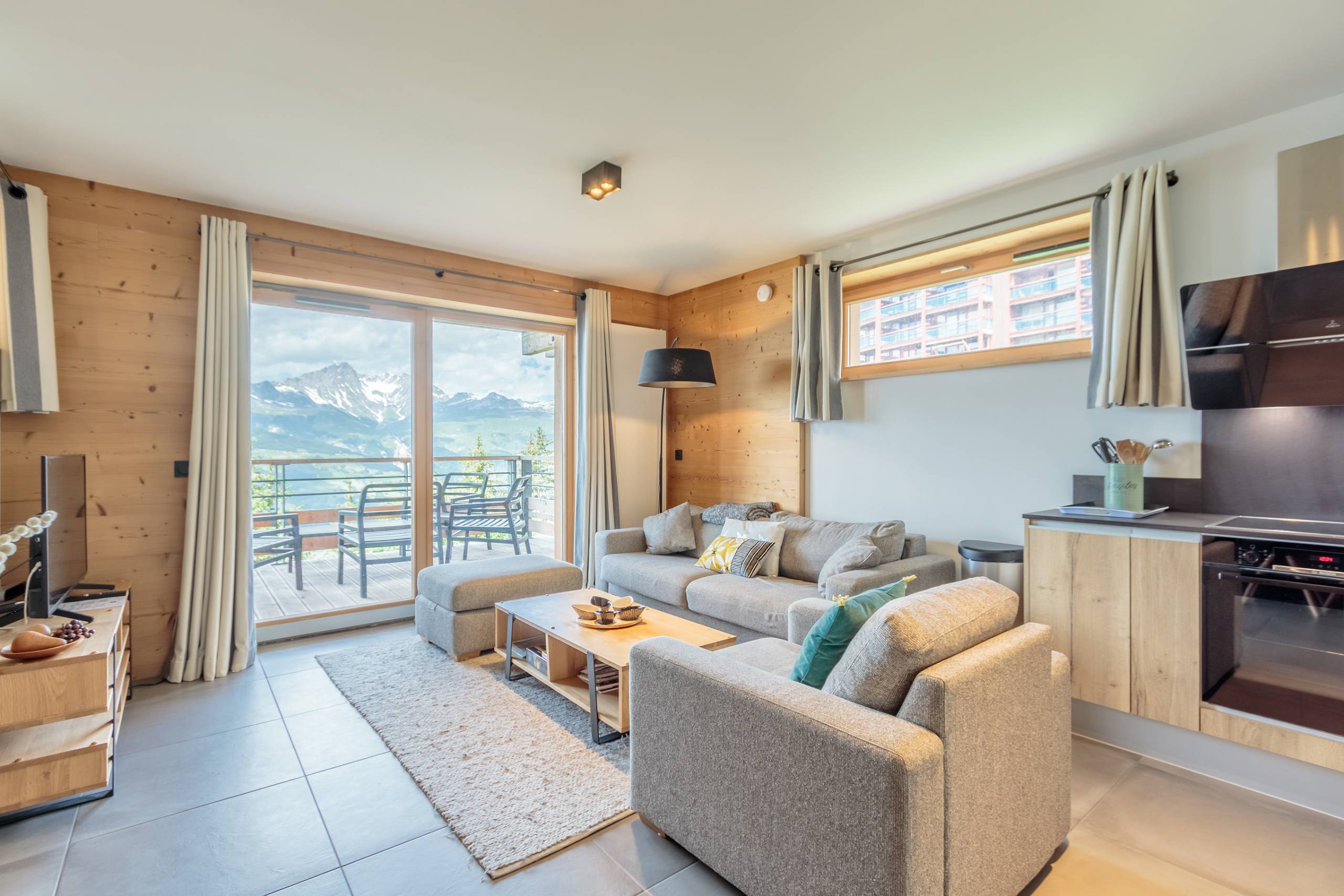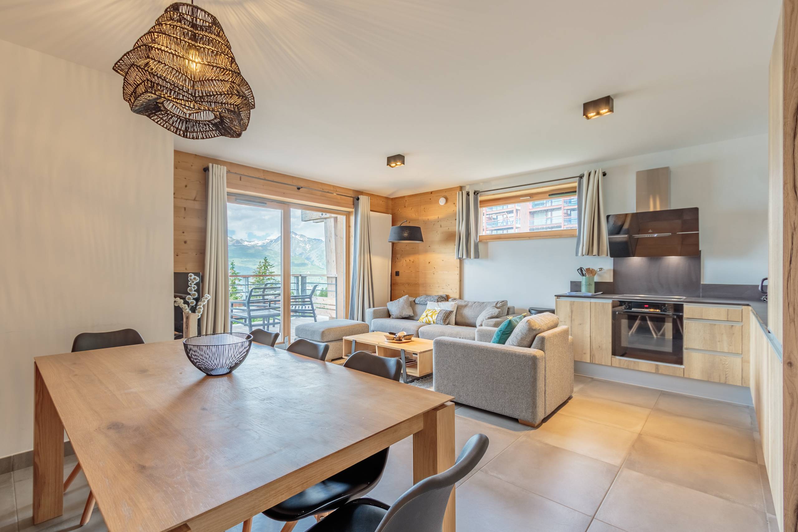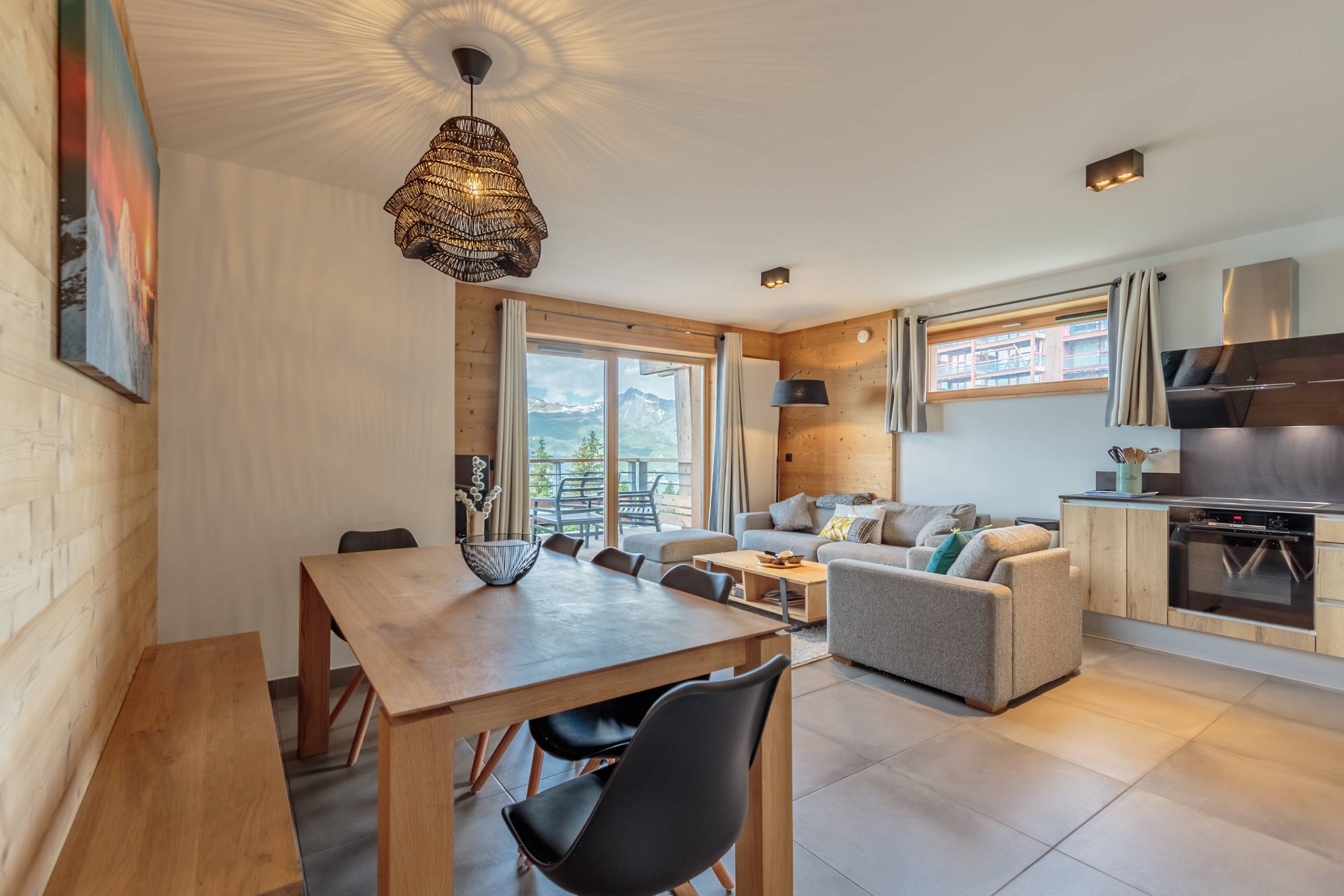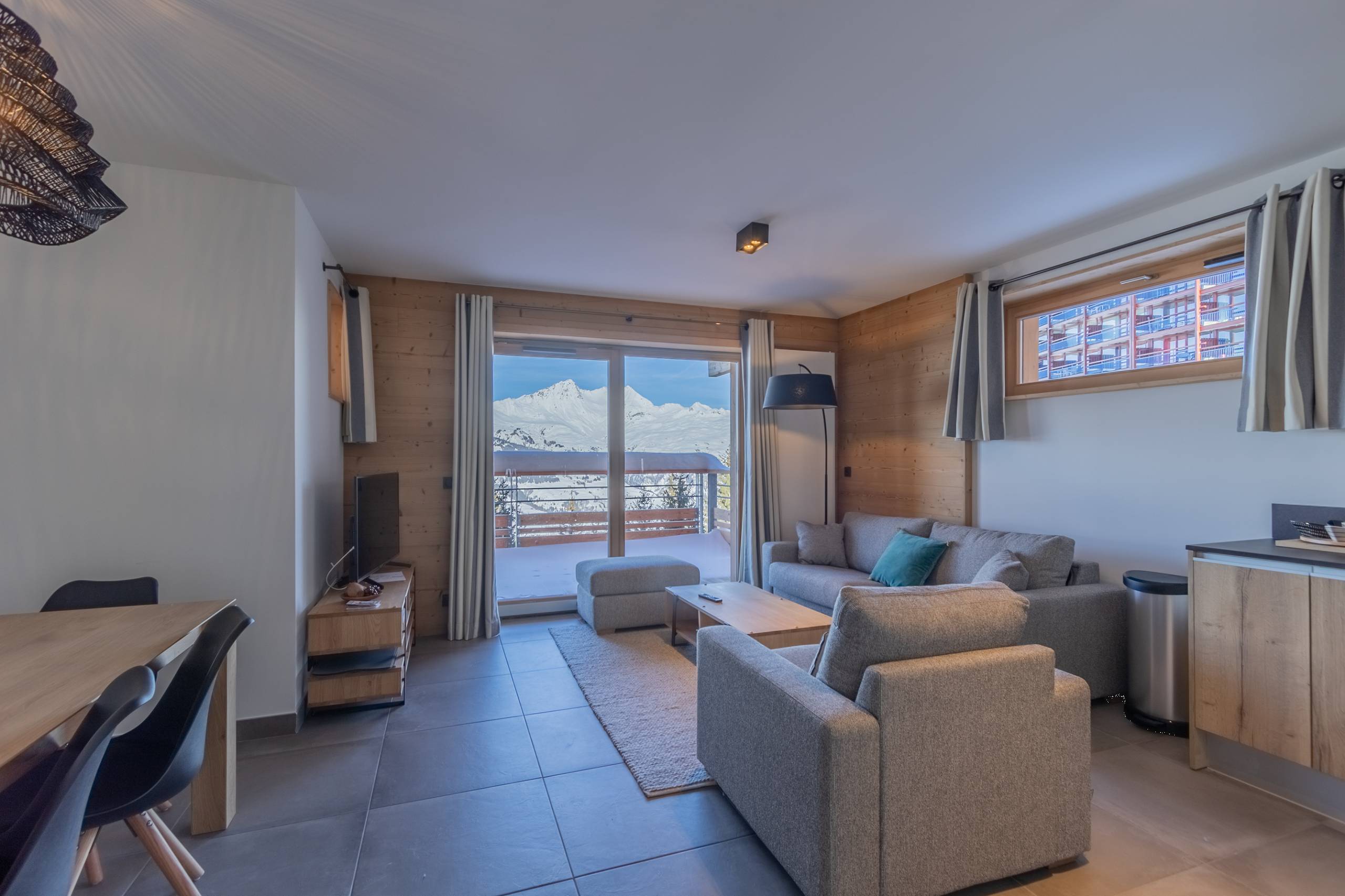 ARCS 1800 - Résidence premium 4* : L’Ecrin. Ambiance Contemporaine et Bois pour ce superbe appartement de 4 pièces classé 5 Cristaux Paradiski, 80 m2, spacieux, moderne et lumineux, pour 8 personnes offrant une magnifique vue sur la vallée de la Tarentaise. Exposition Ouest. Résidence très récente et de standing avec prestations hôtelières, avec son espace détente : sauna, hammam et salle de fitness.