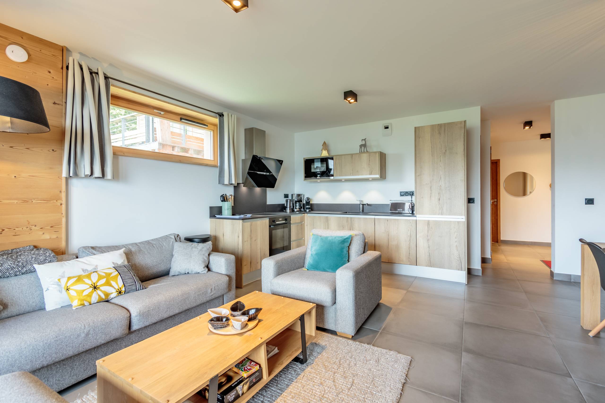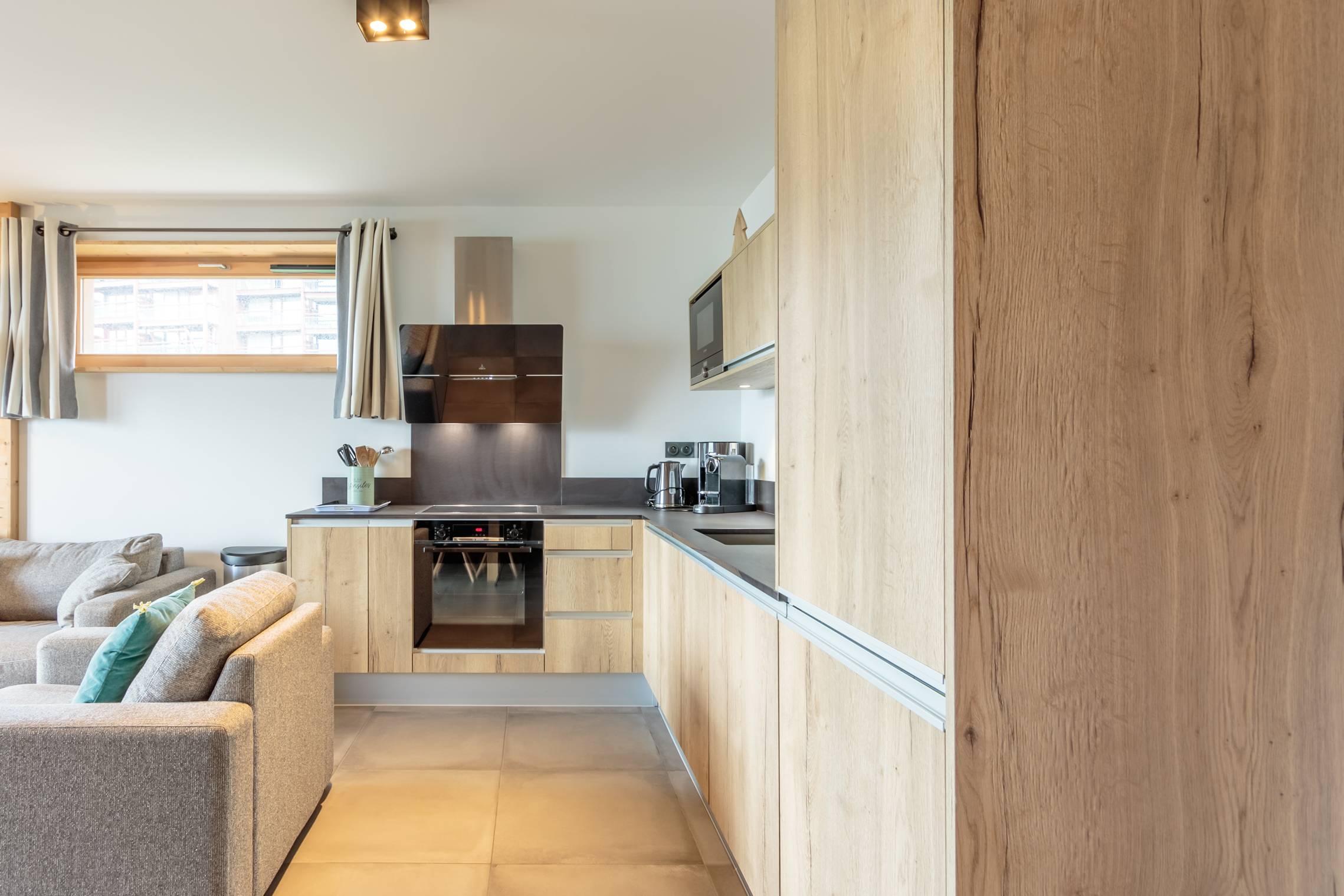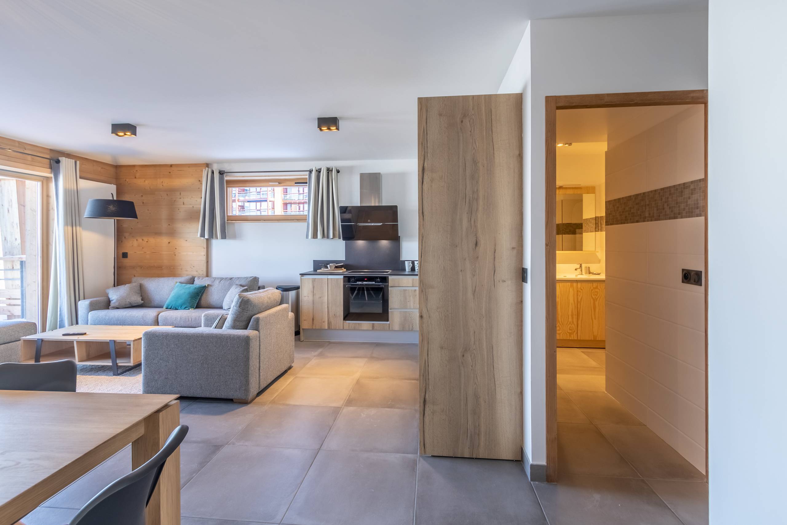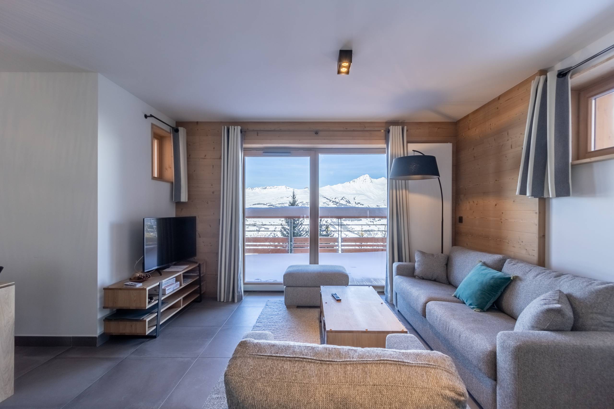 ARCS 1800 - Résidence premium 4* : L’Ecrin. Ambiance Contemporaine et Bois pour ce superbe appartement de 4 pièces classé 5 Cristaux Paradiski, 80 m2, spacieux, moderne et lumineux, pour 8 personnes offrant une magnifique vue sur la vallée de la Tarentaise. Exposition Ouest. Résidence très récente et de standing avec prestations hôtelières, avec son espace détente : sauna, hammam et salle de fitness.