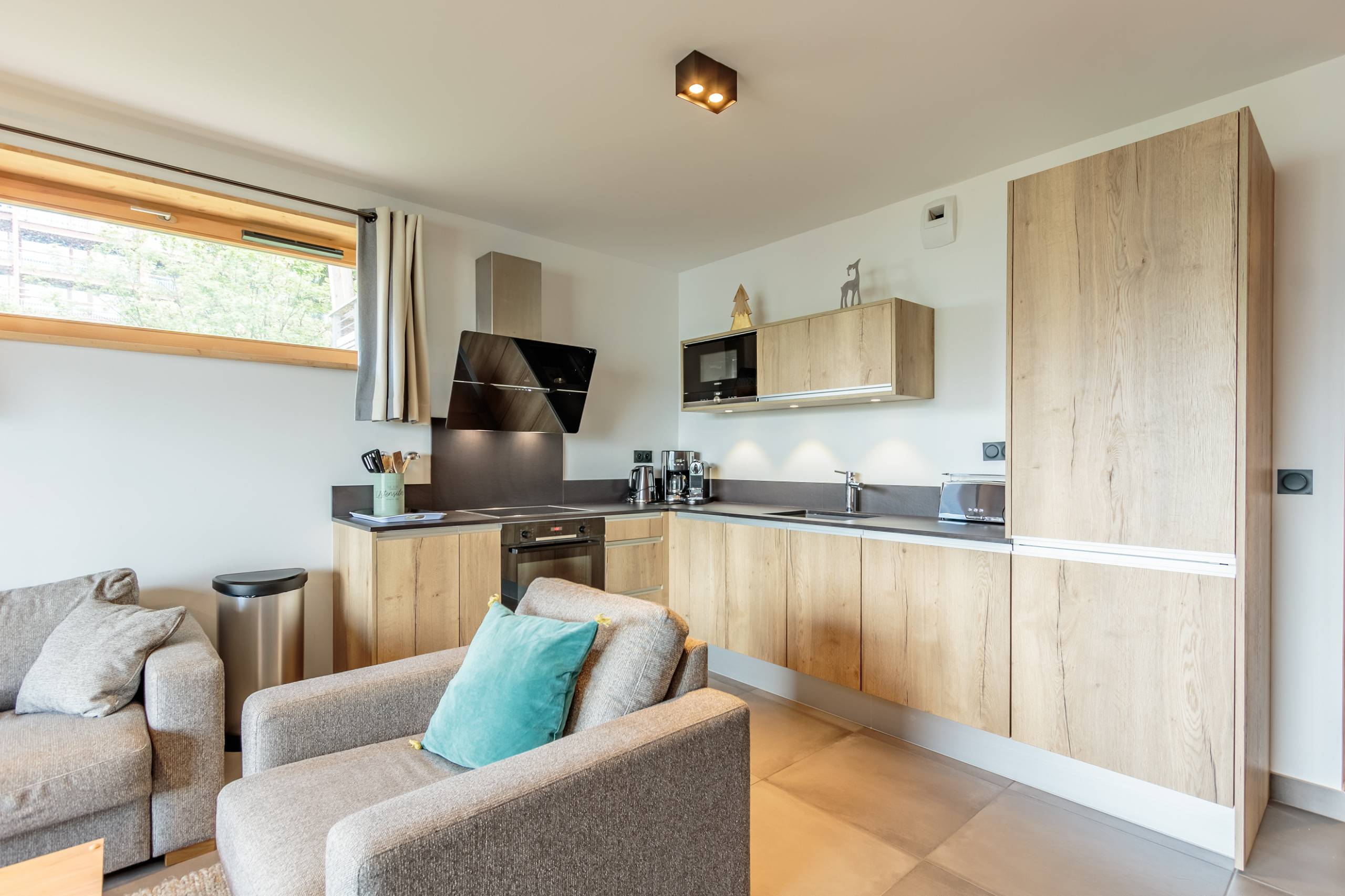 - Cuisine ouverte : plaques de cuisson, lave-vaisselle, réfrigérateur-congélateur, four, cafetière, Nespresso, bouilloire, grille-pain, appareil à raclette, pierrade, appareil à fondue, blender chauffant
