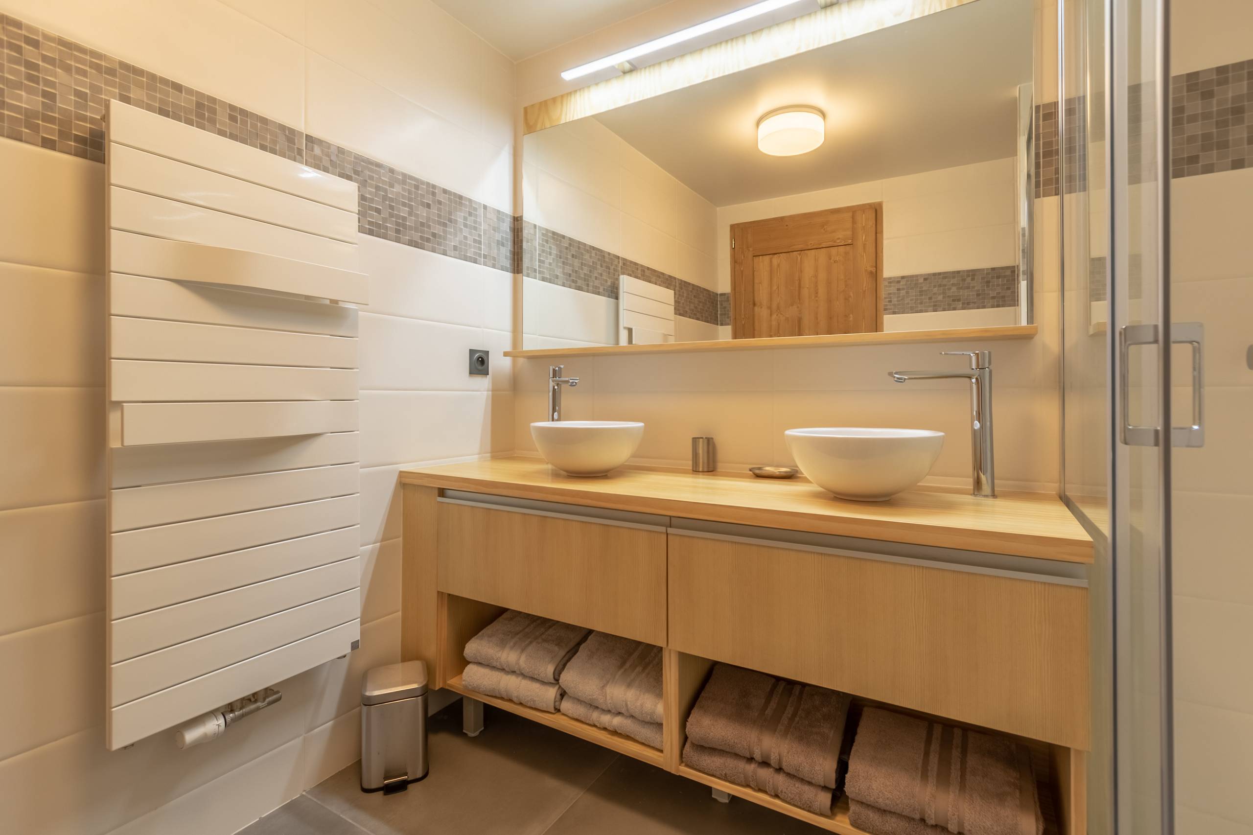 - Chambre n°1 parentale donnant sur une superbe terrasse (vue Vallée) : 1 lit double en 160*190 + salle de douche avec 2 lavabos + sèche-cheveux + sèche-serviette + WC