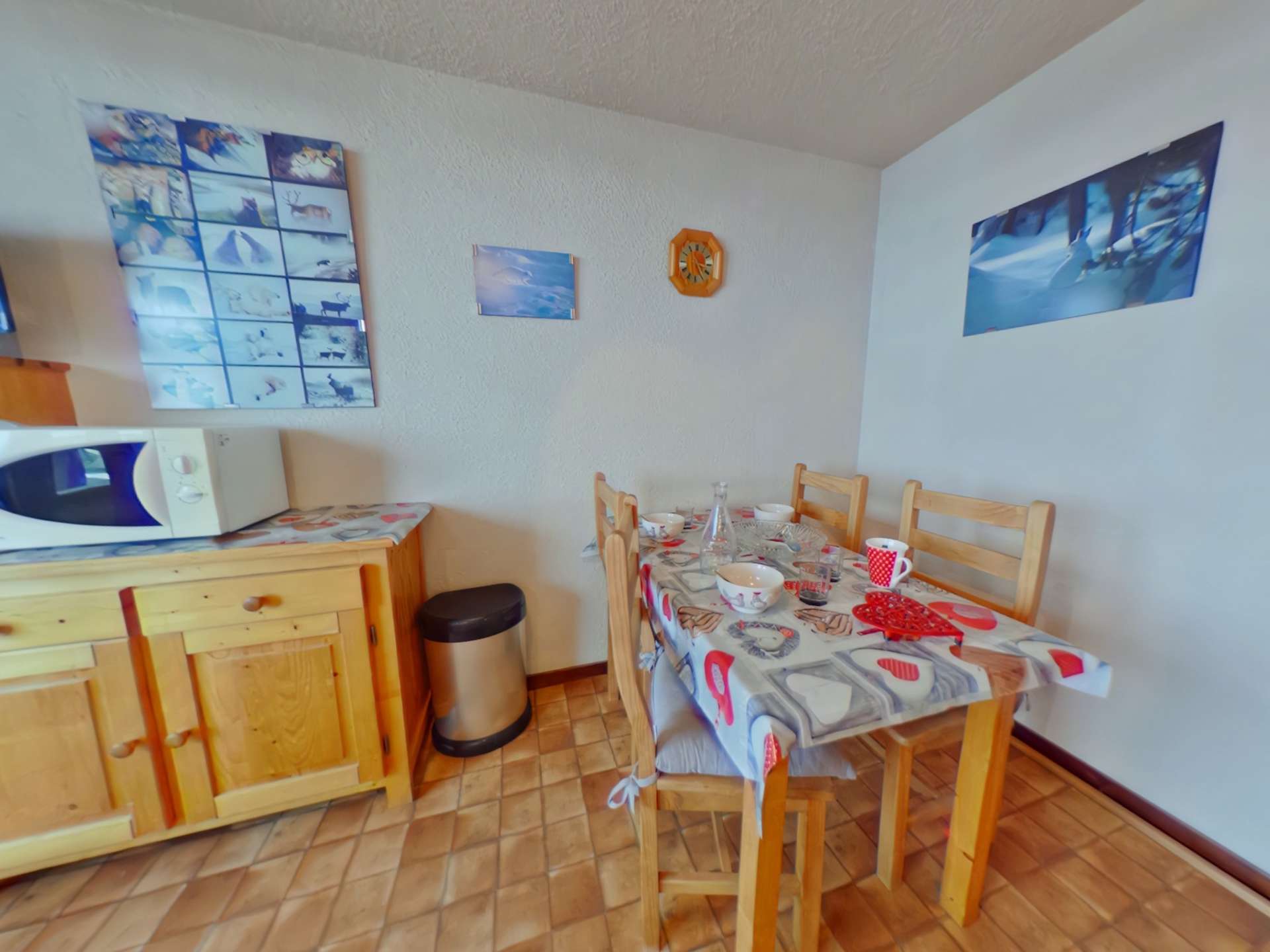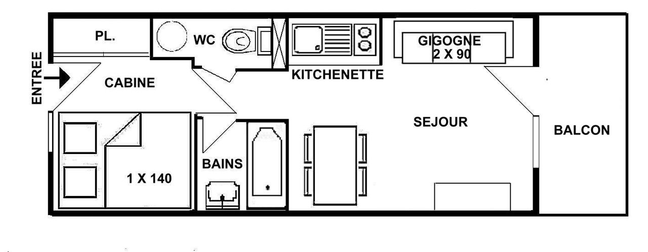 L'appartement comprend une kitchenette équipée, un séjour avec un banquette gigogne 2x80, une cabine avec un lit 140, une salle de bains et un WC séparé.