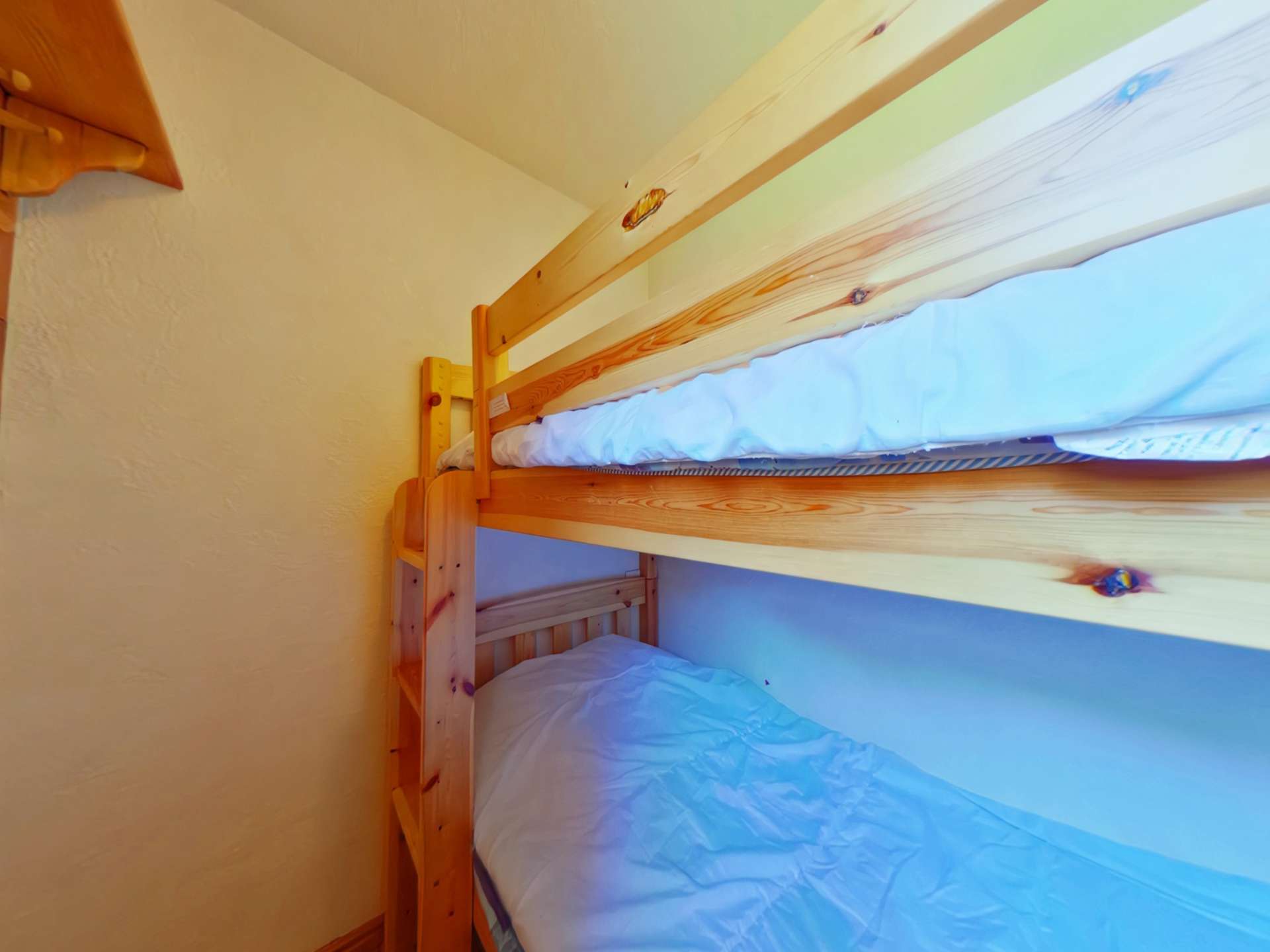 L'appartement se compose d'un séjour ( le canapé n'est pas un couchage), d'une kitchenette équipée, d'une chambre avec un lit 140, d'une cabine avec lits superposés 2x90 (NB: le lit supérieur d'un lit superposé est interdit aux - de 6 ans) et d'une salle d'eau avec WC non séparé.