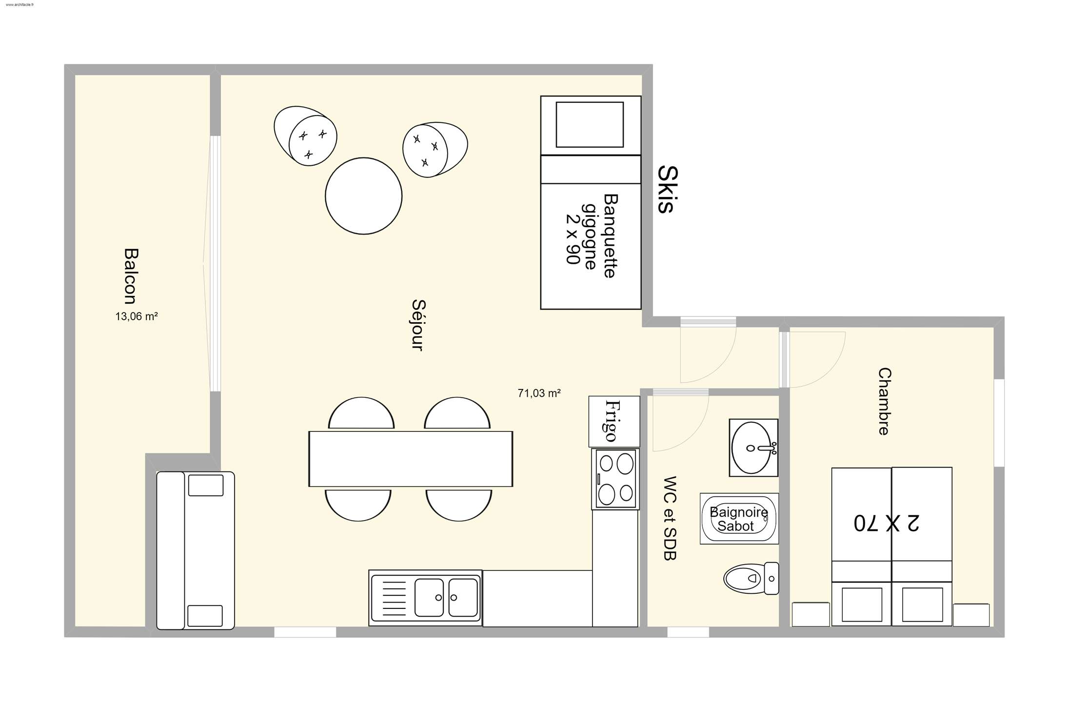 L'appartement se compose d'un séjour avec une banquette gigogne 2x80 et une kitchenette équipée ouverte, d'une chambre avec deux lits 70 côte à côte, d'une salle de bain (baignoire sabot) et WC non séparés.