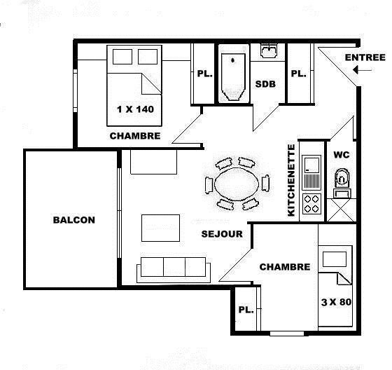 L'appartement se compose d'un séjour avec cuisine équipée ouverte, d'une chambre avec un lit 140, d'une chambre avec lits superposés 2x80 et un lit tiroir 80 (NB : le lit supérieur d'un lit superposé est interdit aux - 6 ans), d'une salle de bains et WC séparé.