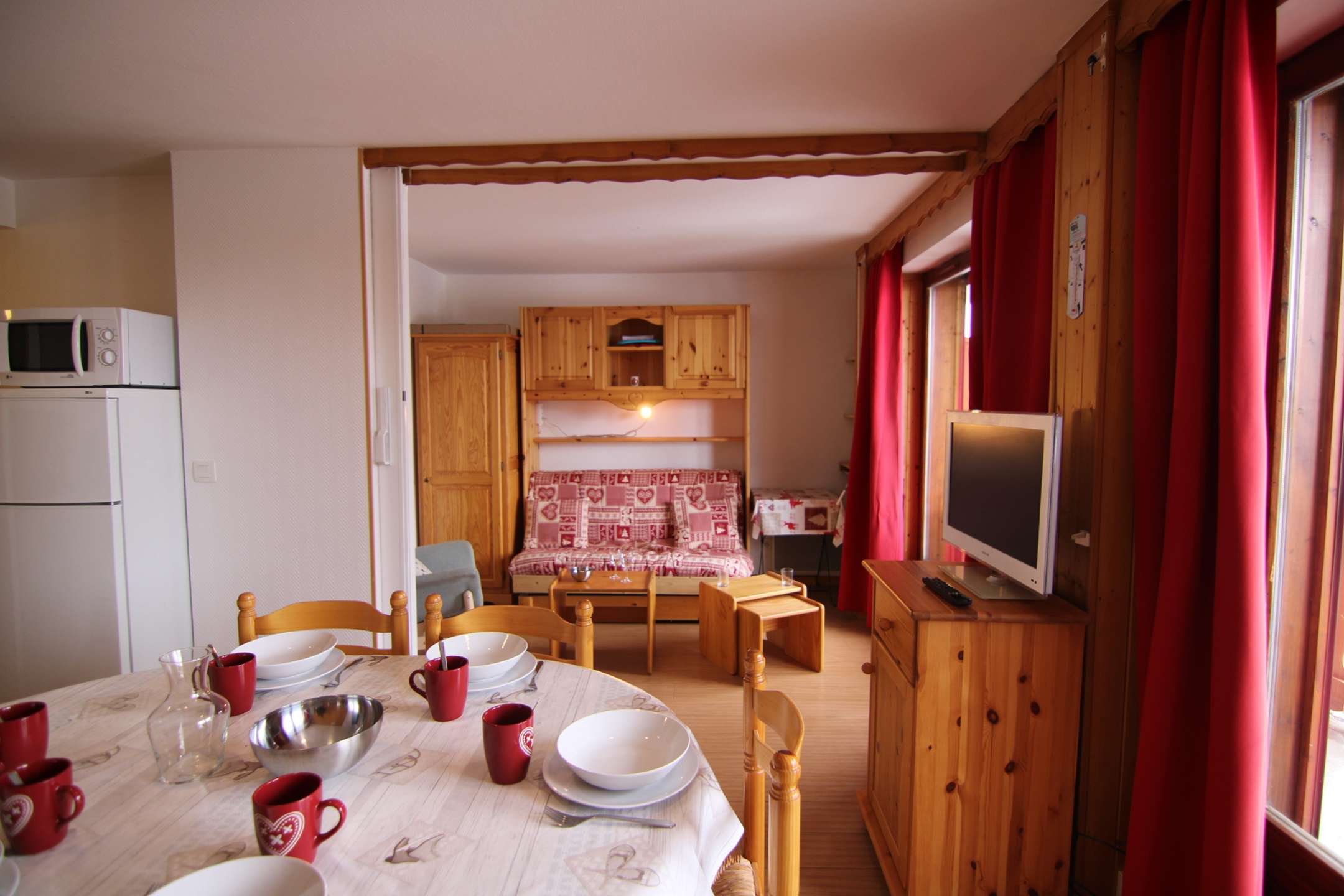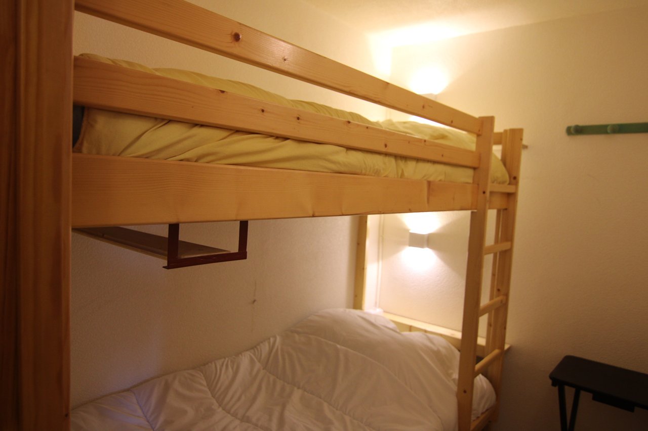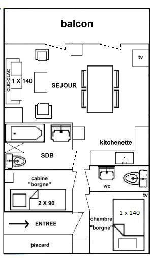 L'appartement comprend une cuisine équipée, un séjour avec un canapé en 140, une chambre borgne avec un lit en 140, une cabine borgne avec des lits superposés 2x80, une salle de bains avec wc non séparé et un wc séparé (N.B : le lit supérieur des lits superposés est interdit aux - de 6 ans)