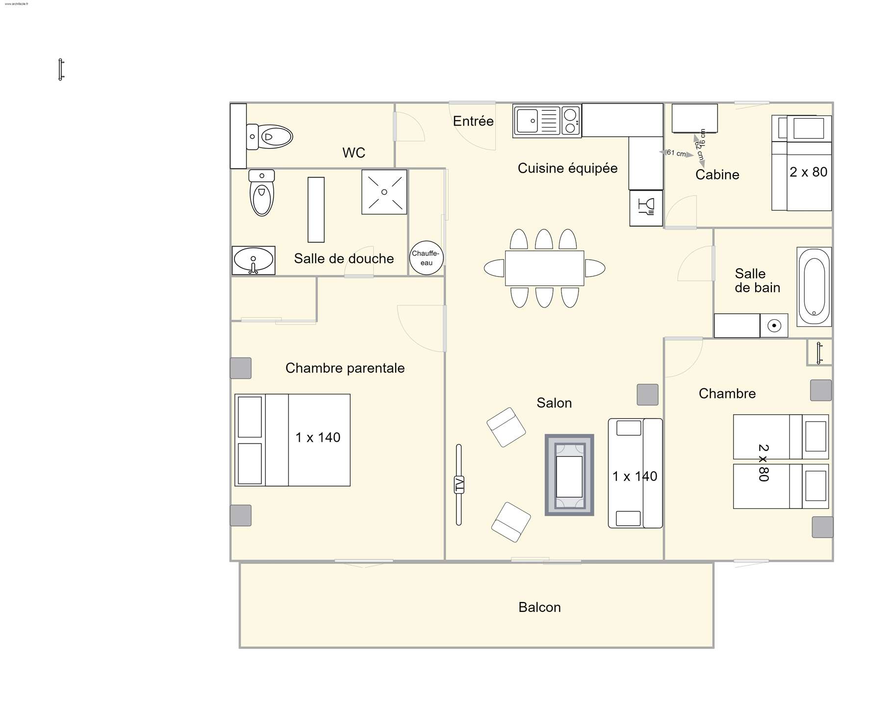 L'appartement se compose d'un séjour avec un canapé convertible 140, d'une suite parentale avec un lit 140 et une salle d'eau avec WC attenante, d'une chambre avec deux lits 80 côte à côte, d'une cabine avec deux lits superposés 80 (NB : le lit supérieur d'un lit superposé est interdit aux - 6 ans), d' une salle de bain et WC séparé.