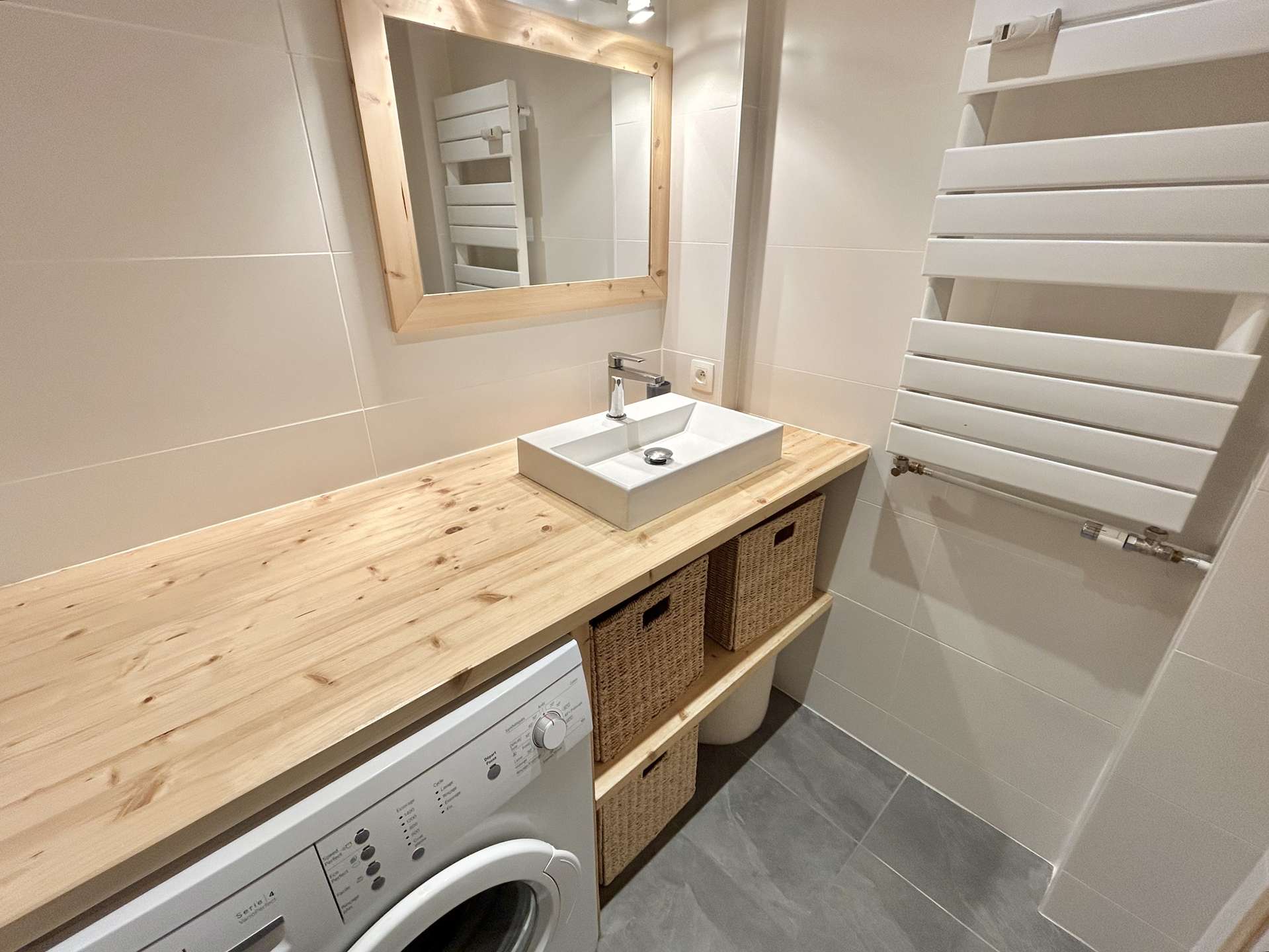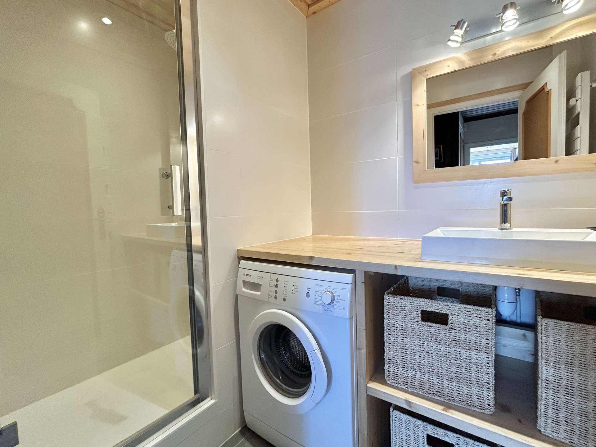 Le logement se compose d’un hall d’entrée avec placards, d’un WC séparé, d’une salle de douche avec lave-linge, d’une cuisine indépendante équipée, ainsi que d’un séjour/salon avec canapé convertible deux places (140 x 190), télévision, et accès à un balcon exposé ouest. La chambre dispose de deux lits simples (80 x 190), de placards, et donne également accès au balcon.