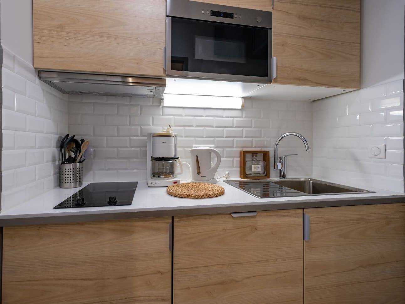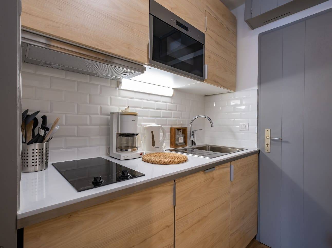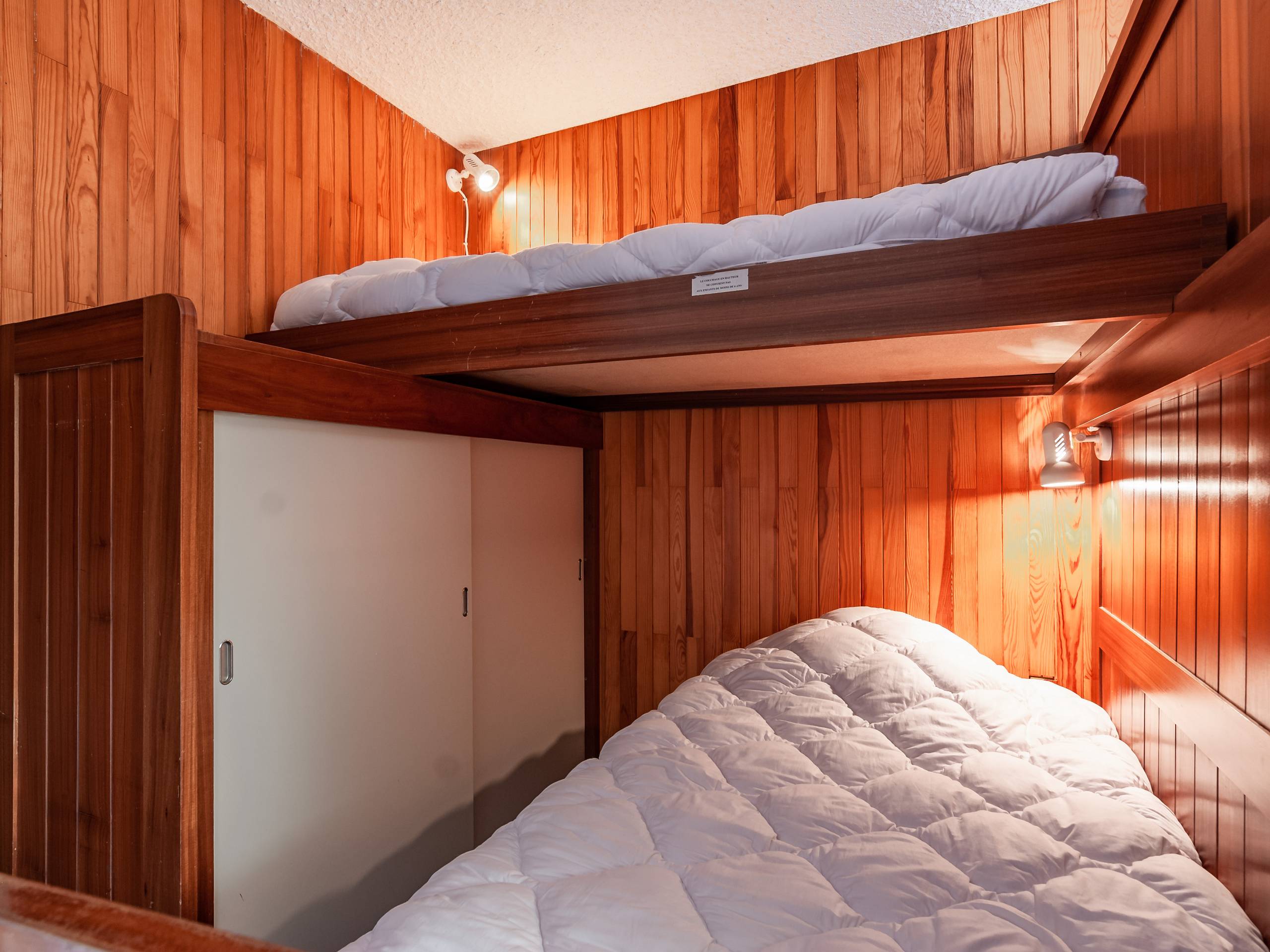 Séjour avec un lit double (coulissant sous la cloison de 140x190), un ensemble de lits superposés (90x190) et la télévision. Kitchenette dans l'entrée équipée de plaques de cuisson, four, cafetière nespresso, lave-vaisselle et réfrigérateur. Salle de bains avec WC. Balcon. Casier à skis et ascenseur dans la résidence. Appartement situé au 5ème étage. Appartement non-fumeur / Animaux non admis.