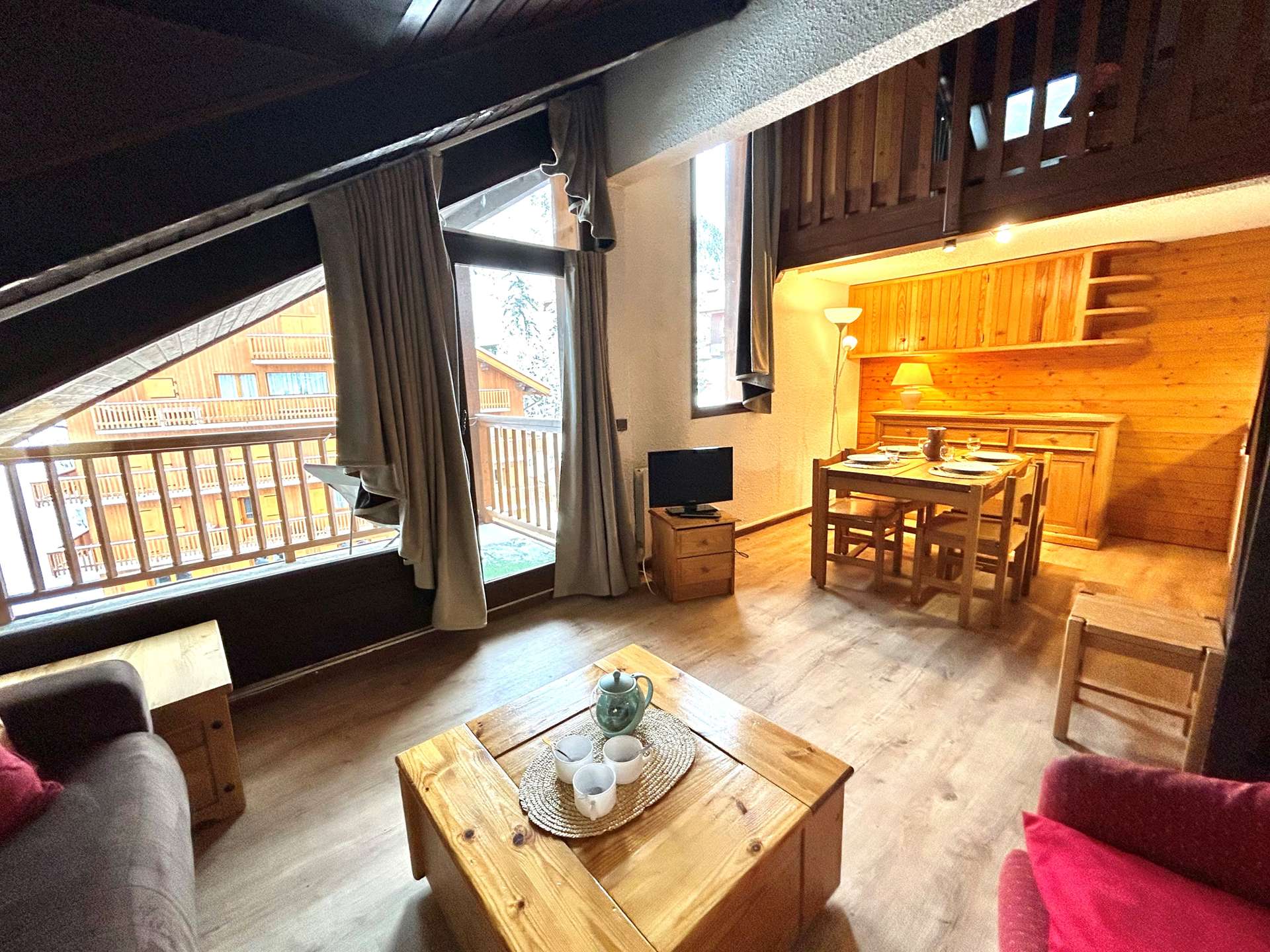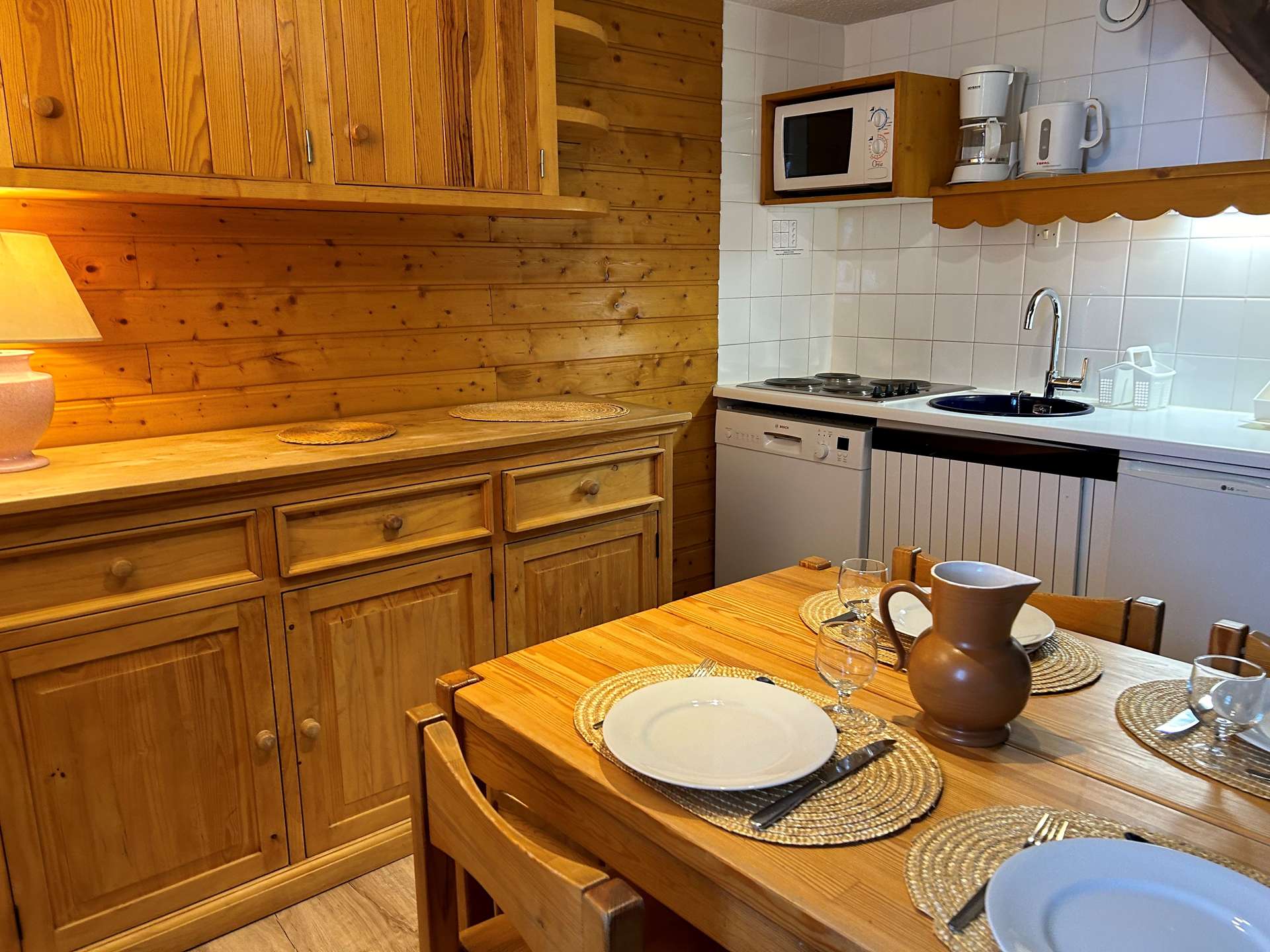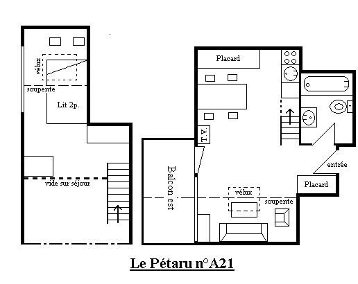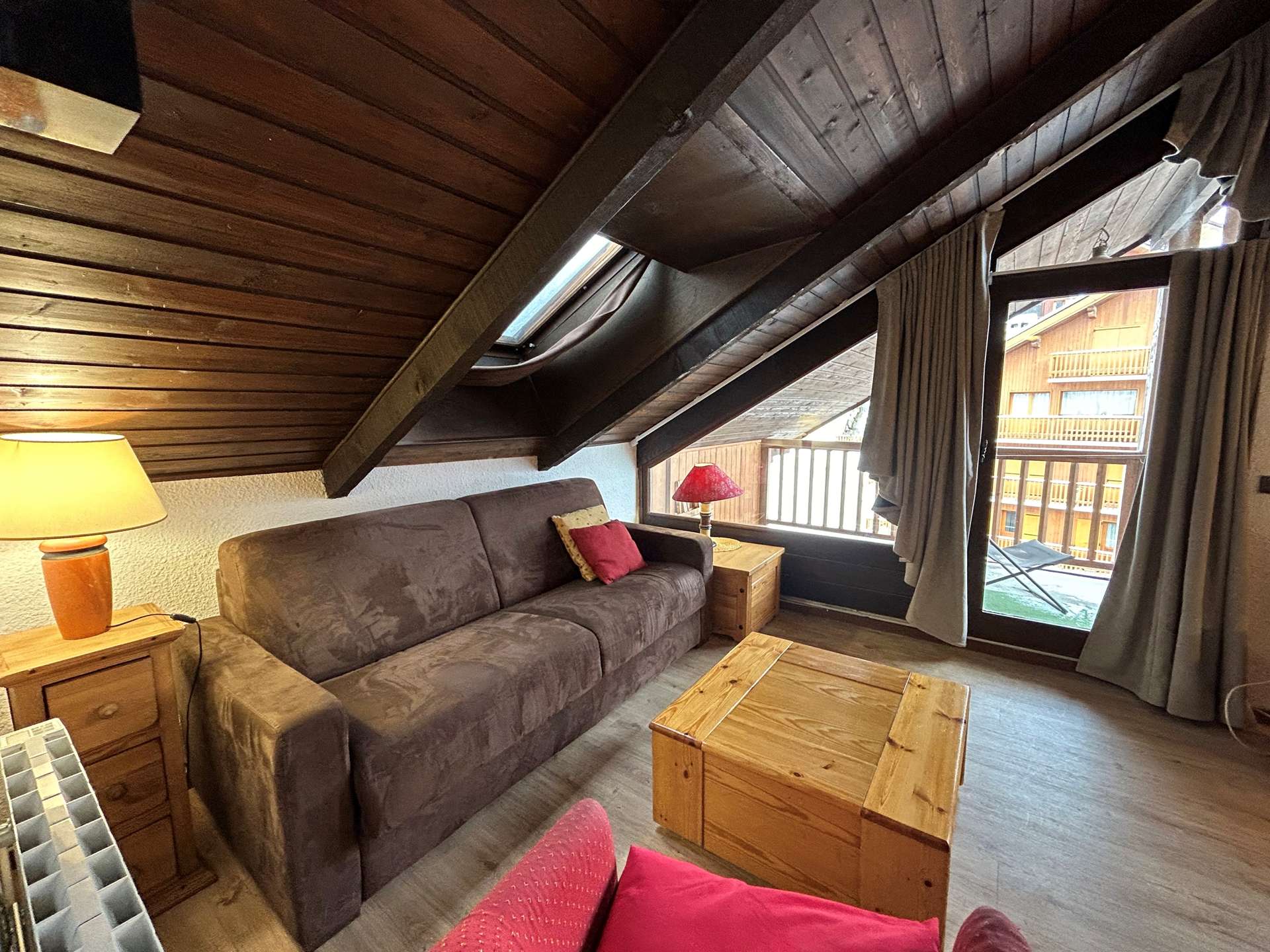 Cet appartement studio mezzanine à la montagne, accessible par l'entrée A, situé au 5ème étage avec ascenseur comprend une petite cuisine équipée avec lave-vaisselle ouverte sur le séjour avec canapé lit 2 personnes (160), télévision, loggia est, une mezzanine avec lit double, une salle de bain avec WC, 1 casier à ski (n°A21) à l'entrée de la résidence.