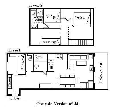 Cette location de vacances aux ski située au 4ème étage, sans ascenseur, comprend un séjour avec un canapé d'angle et une télévision, une cuisine ouverte équipée d’un lave-vaisselle, une chambre avec 1 ensemble de lits superposés, une salle d'eau, un wc indépendant et un balcon exposé Ouest. L’étage comprend 2 chambres avec 2 lits doubles 2 personnes 140, 1 cabine avec 1 ensemble de lits superposés et 1 salle d'eau avec wc.