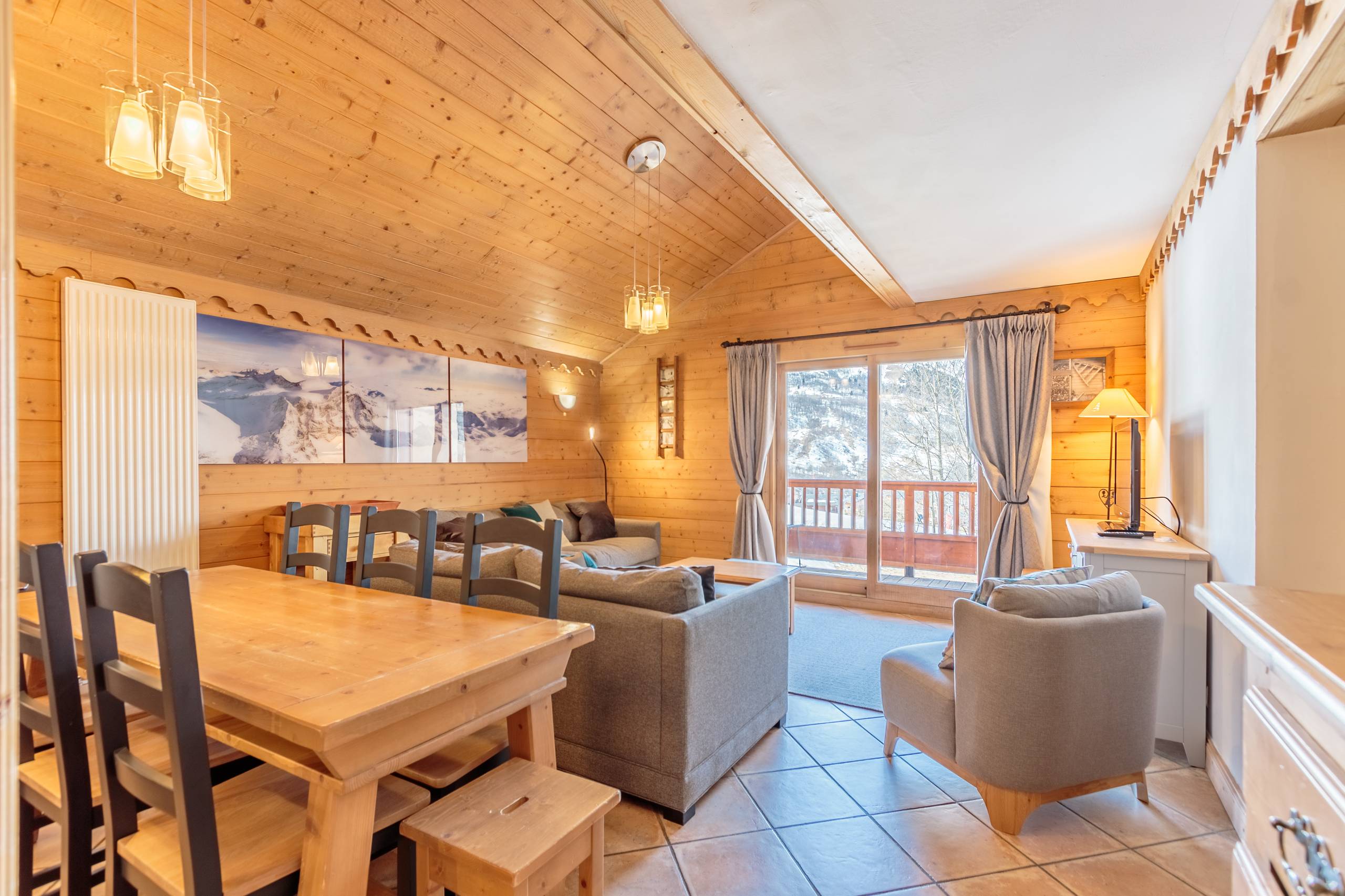 - Séjour spacieux avec téléviseur et balcon exposé SUD OUEST, vue pistes et village, au 3eme ÉTAGE avec ascenseur