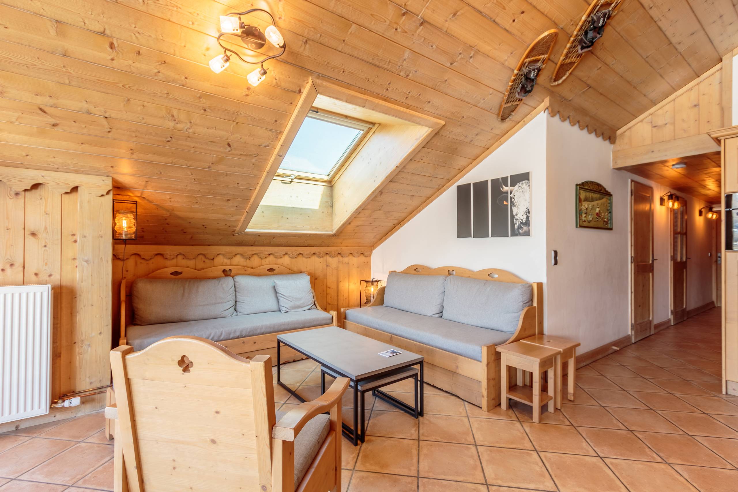 - Grand séjour avec téléviseur et balcon exposé SUD OUEST, vue pistes et village, au 4ème ÉTAGE avec ascenseur