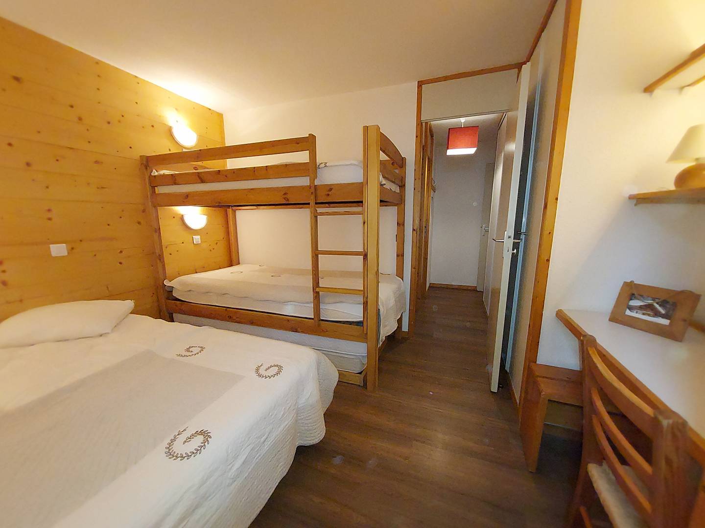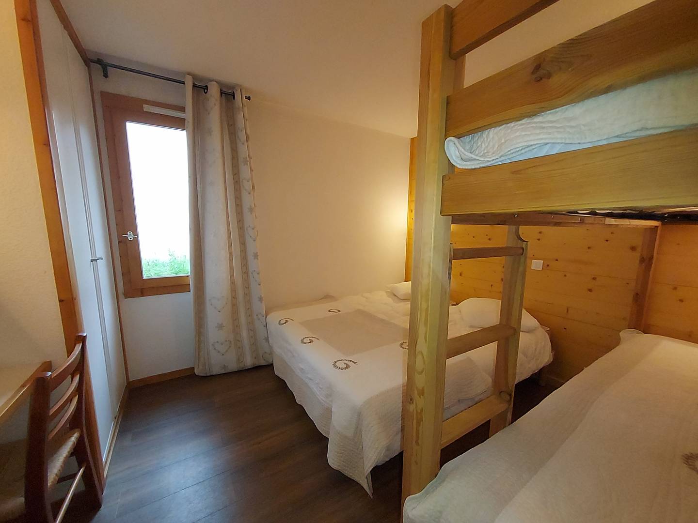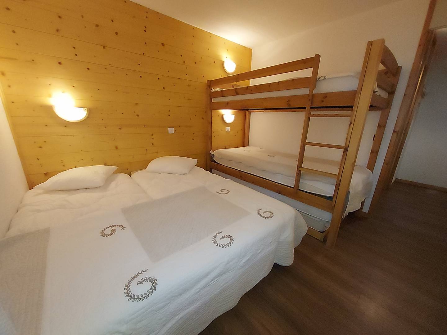 Séjour avec 2 lits simples, télevision. Chambre avec un lit superposé, et 2 lits simples Cuisine équipée de plaques vitrocéramiques, four, micro ondes, lave vaisselle et réfrigérateur 100cm. Salle de bains et wc indépendant. Balcon. Casier à skis dans la résidence.
