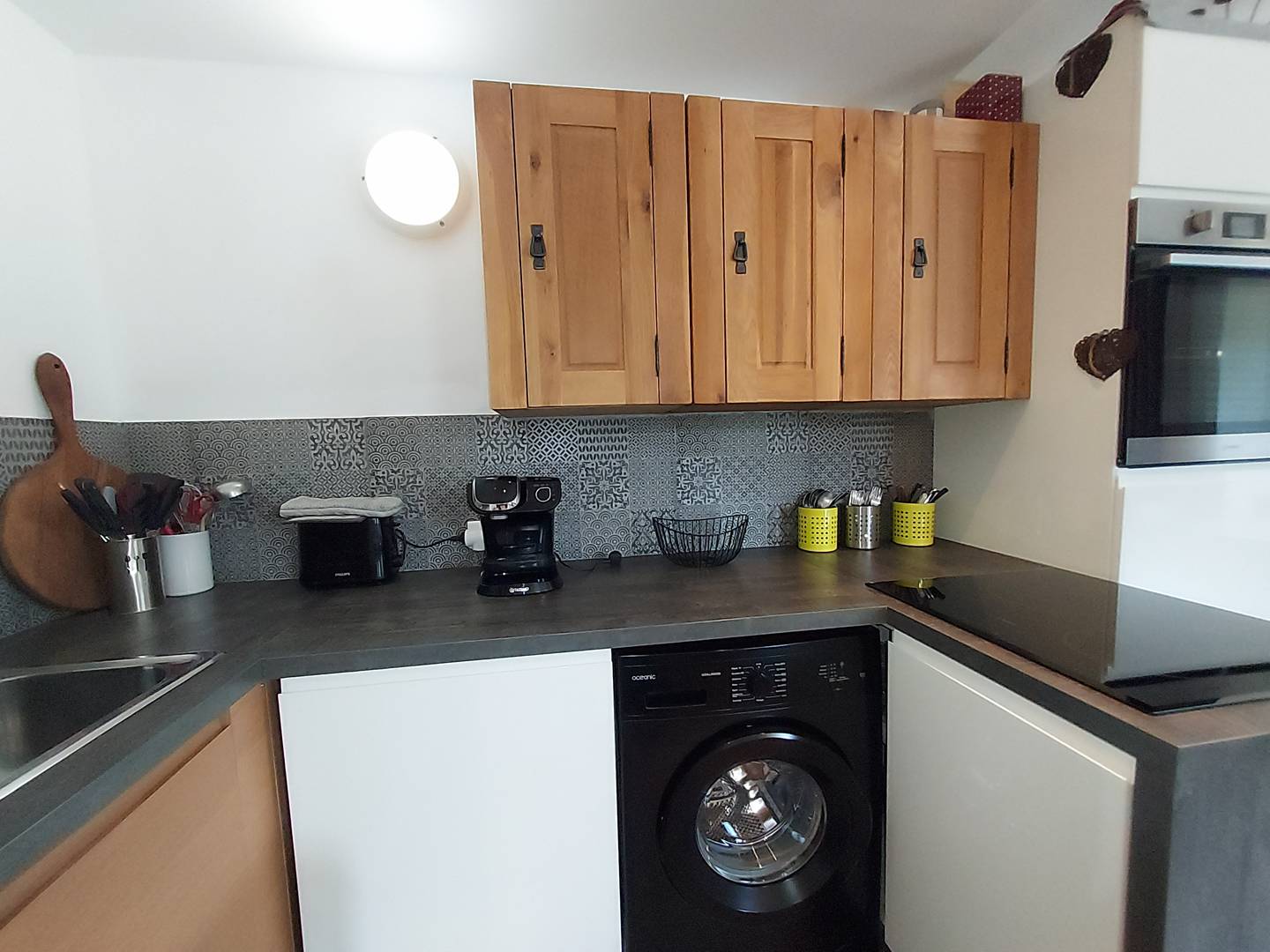 • Cuisine américaine entièrement équipée : plaques induction, four, lave-vaisselle, lave-linge, réfrigérateur.