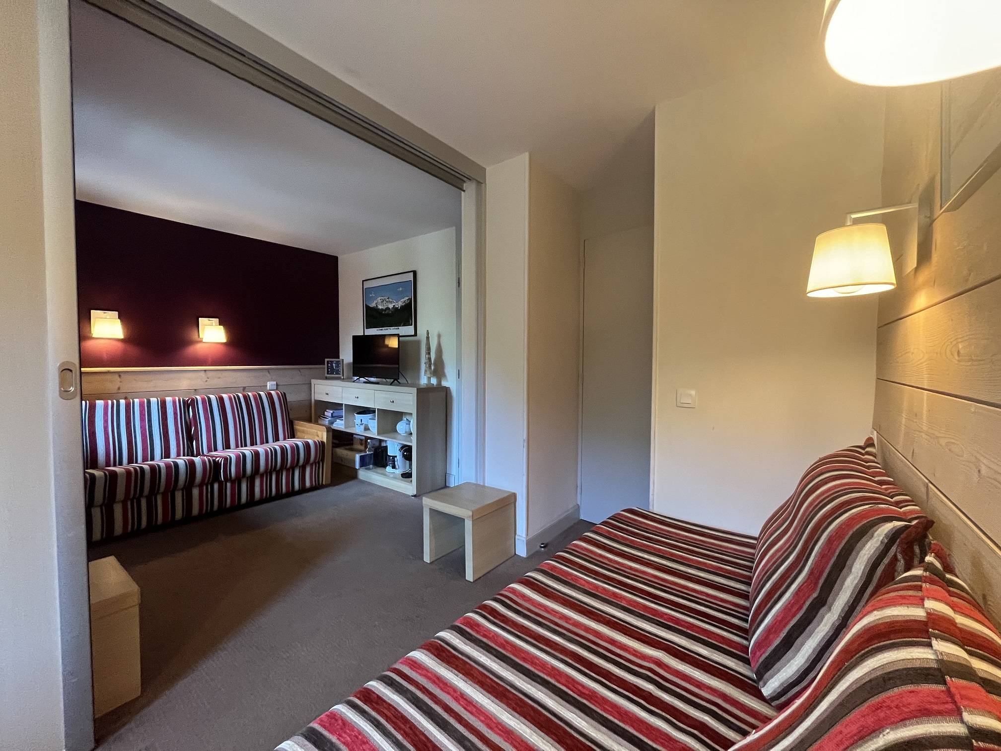 The living room, separated into two spaces by a sliding partition, is equipped with a convertible sofa bed (140 * 200), a single bed (90 * 190) and a pull-out bed (80 * 190). It has a TV.