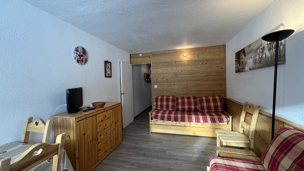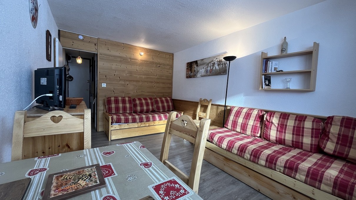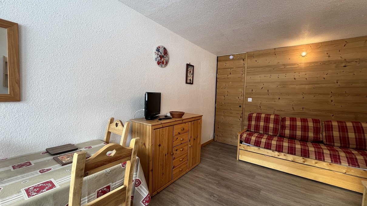 - The living room, very bright, has 2 bench seats with pull-out beds (4 persons - 80 x 190) with a dining area opening onto a balcony with a view of the slopes