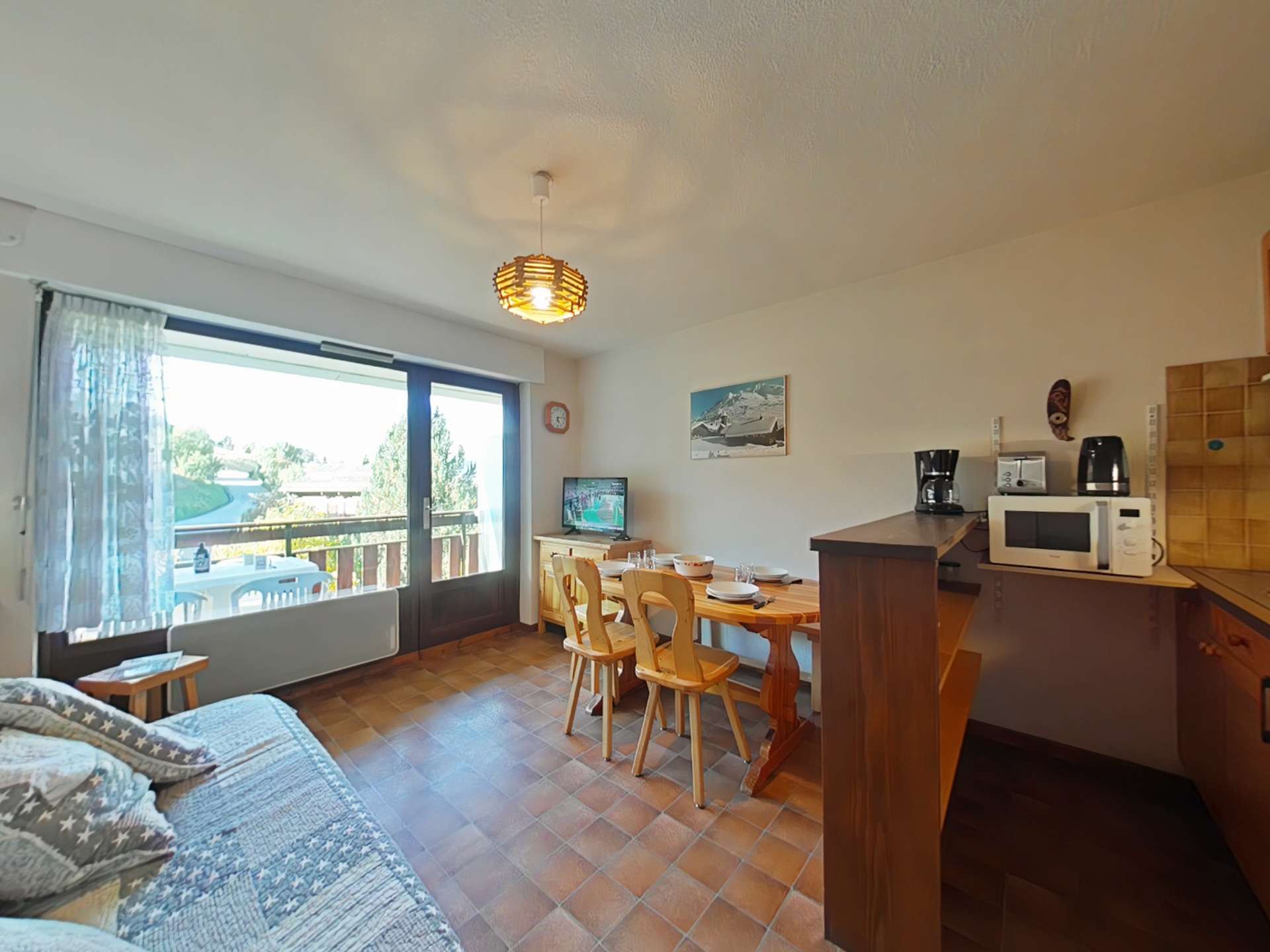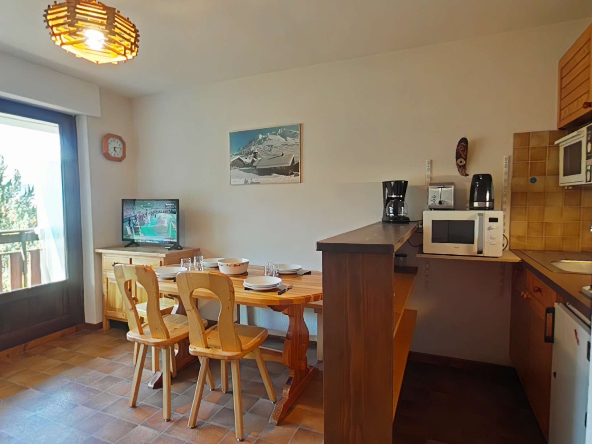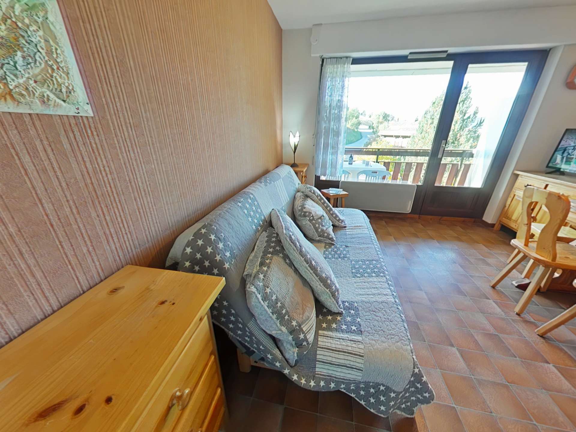 This ground floor holiday apartment comprises a living room with a double sofa bed, television, a south-west facing balcony with views of the slopes and the village, a fully equipped kitchen area, a sleeping area with two bunk beds, and a bathroom with toilet.