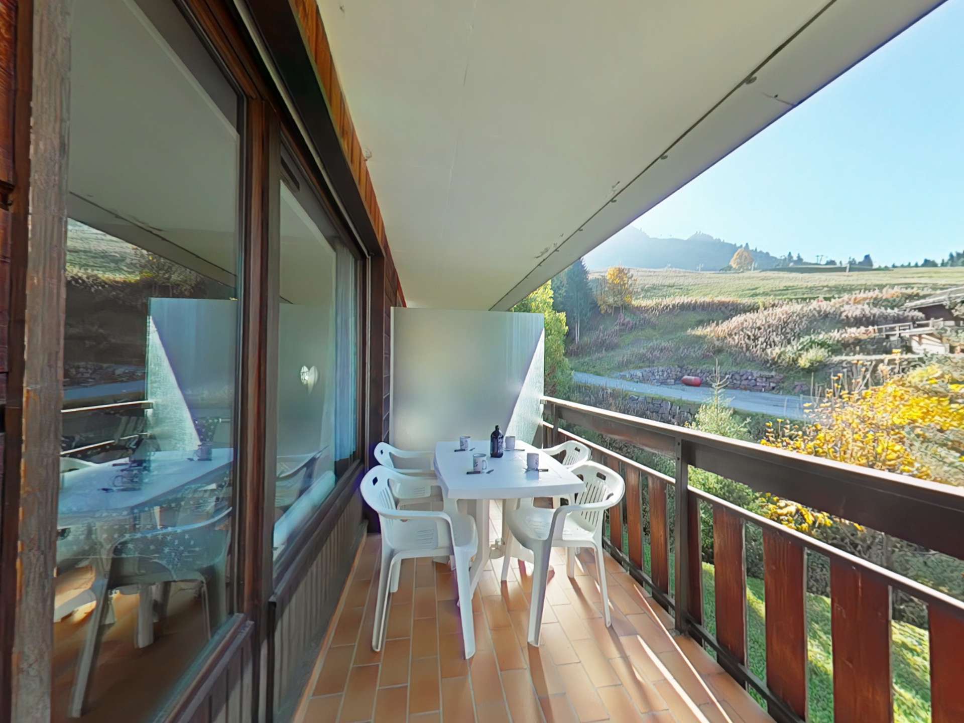 This ground floor holiday apartment comprises a living room with a double sofa bed, television, a south-west facing balcony with views of the slopes and the village, a fully equipped kitchen area, a sleeping area with two bunk beds, and a bathroom with toilet.