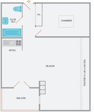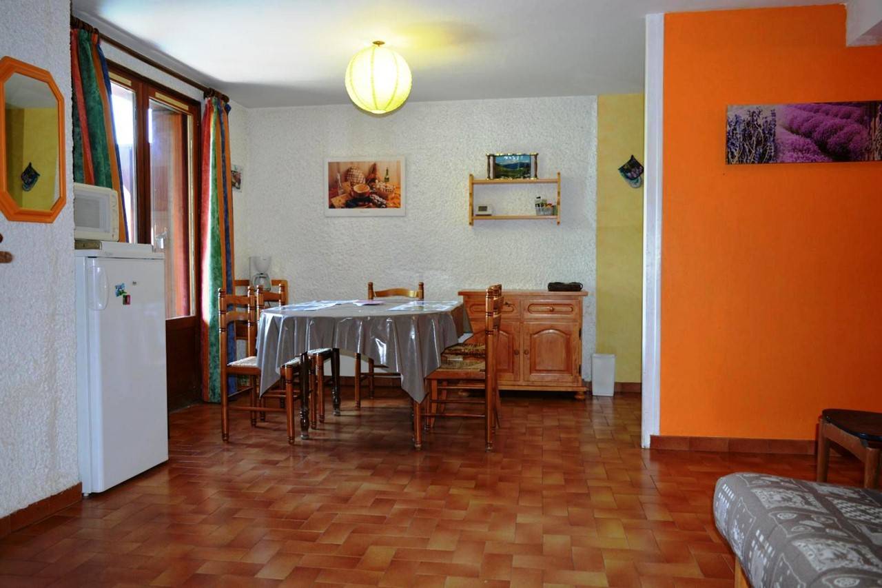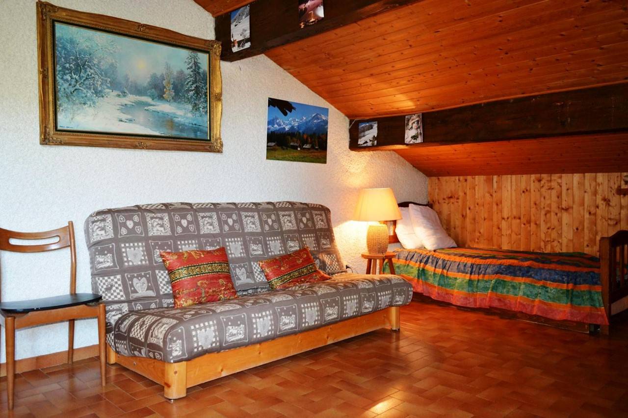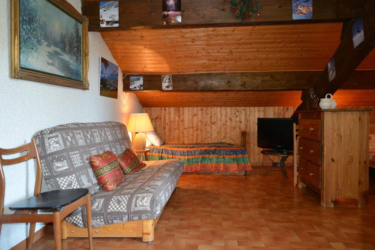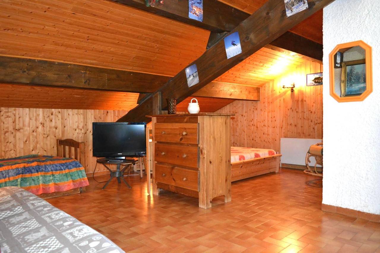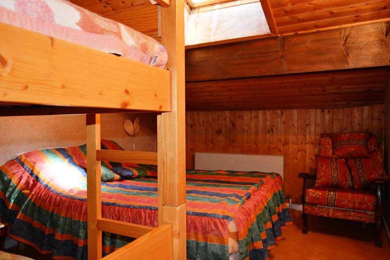 This vacation apartment, located on the 3rd floor, includes a living room with a comfortable sofa and television, a sleeping area with a double bed and access to a south-facing balcony overlooking the ski slopes, an equipped kitchenette, a bedroom with a double bed and two single bunk beds, and a bathroom with a toilet.