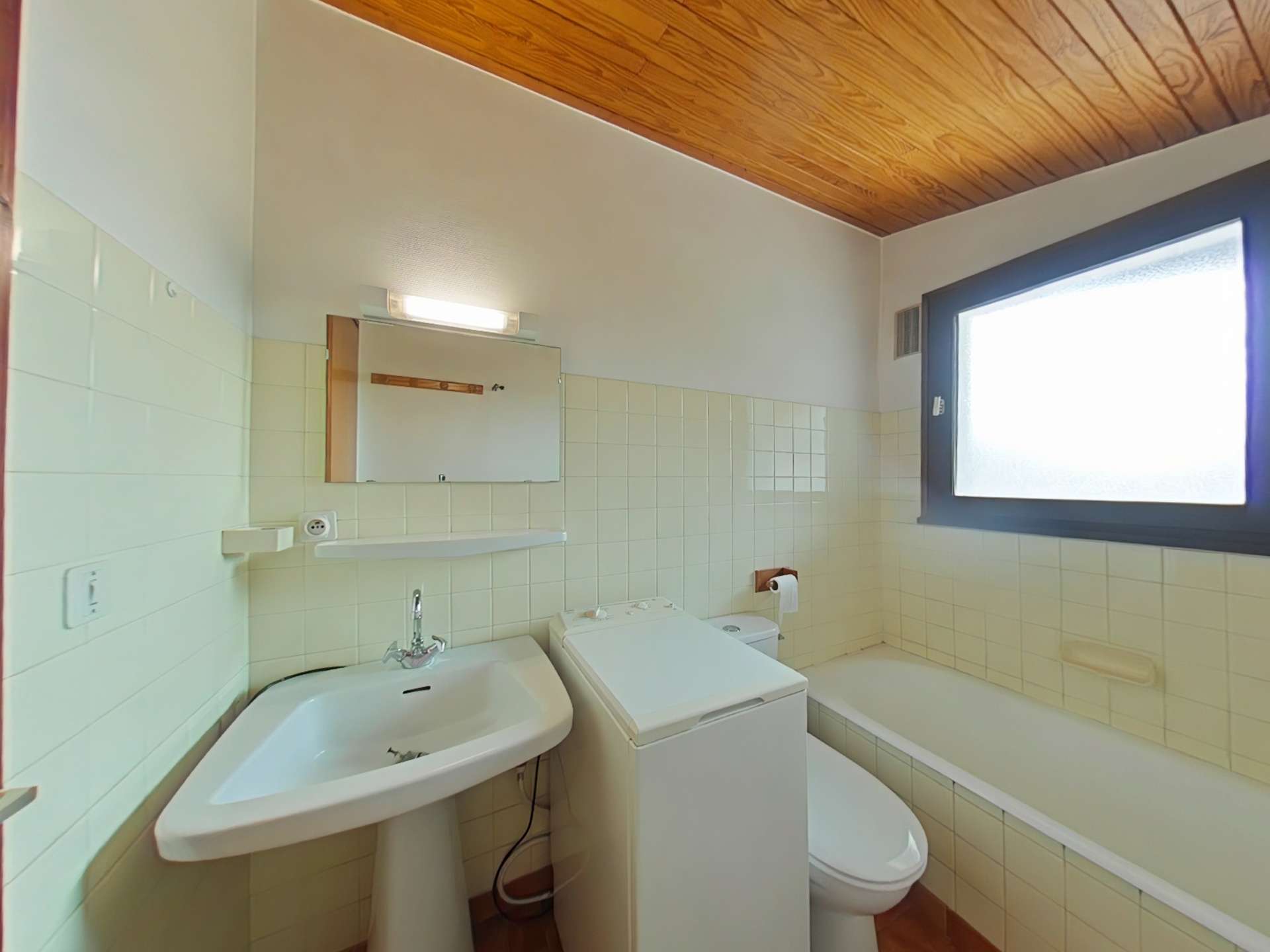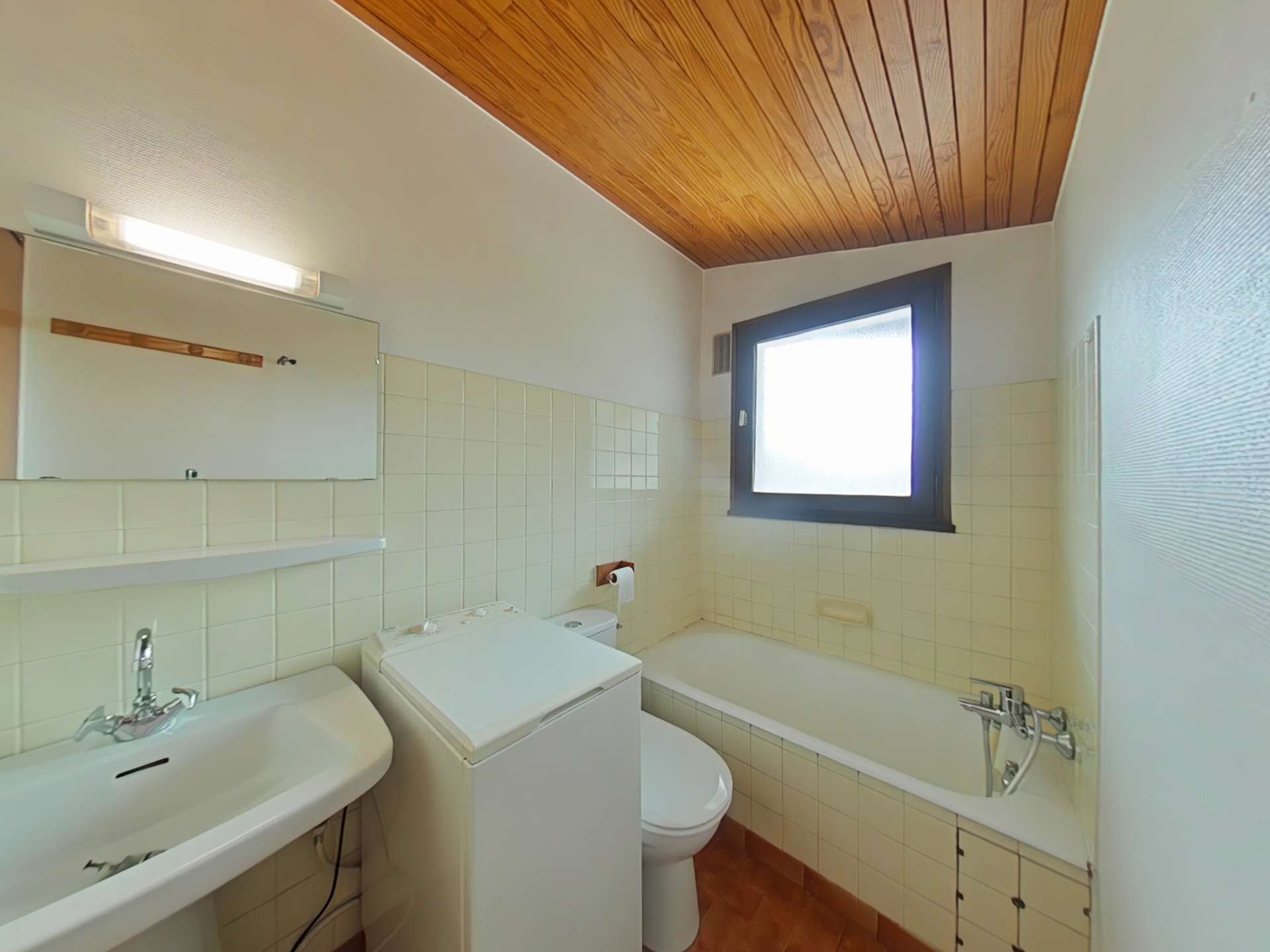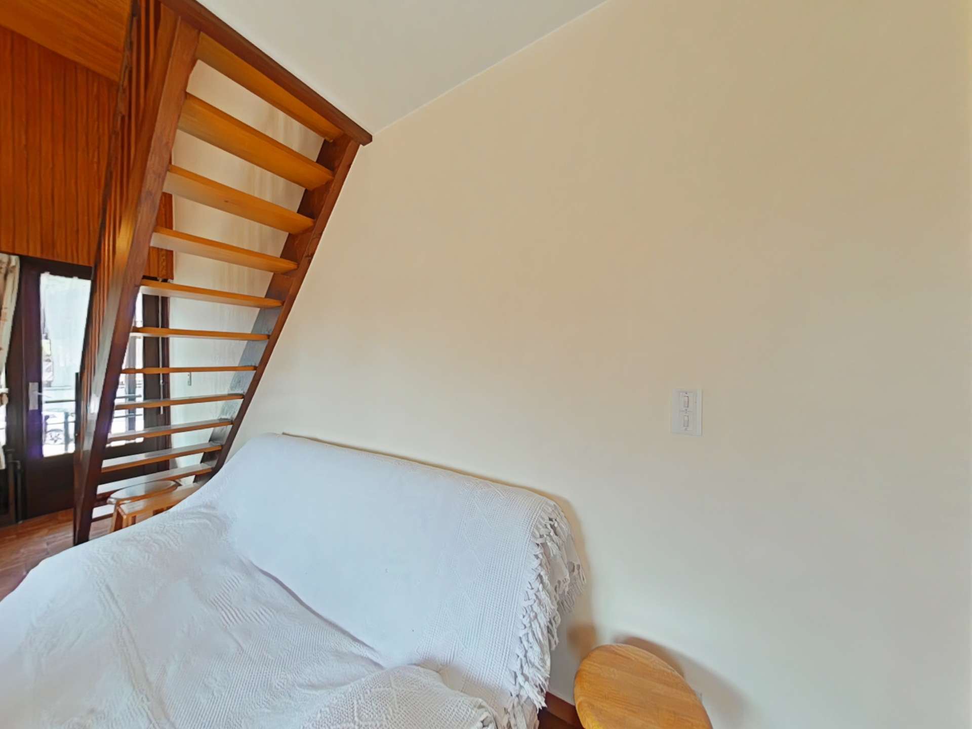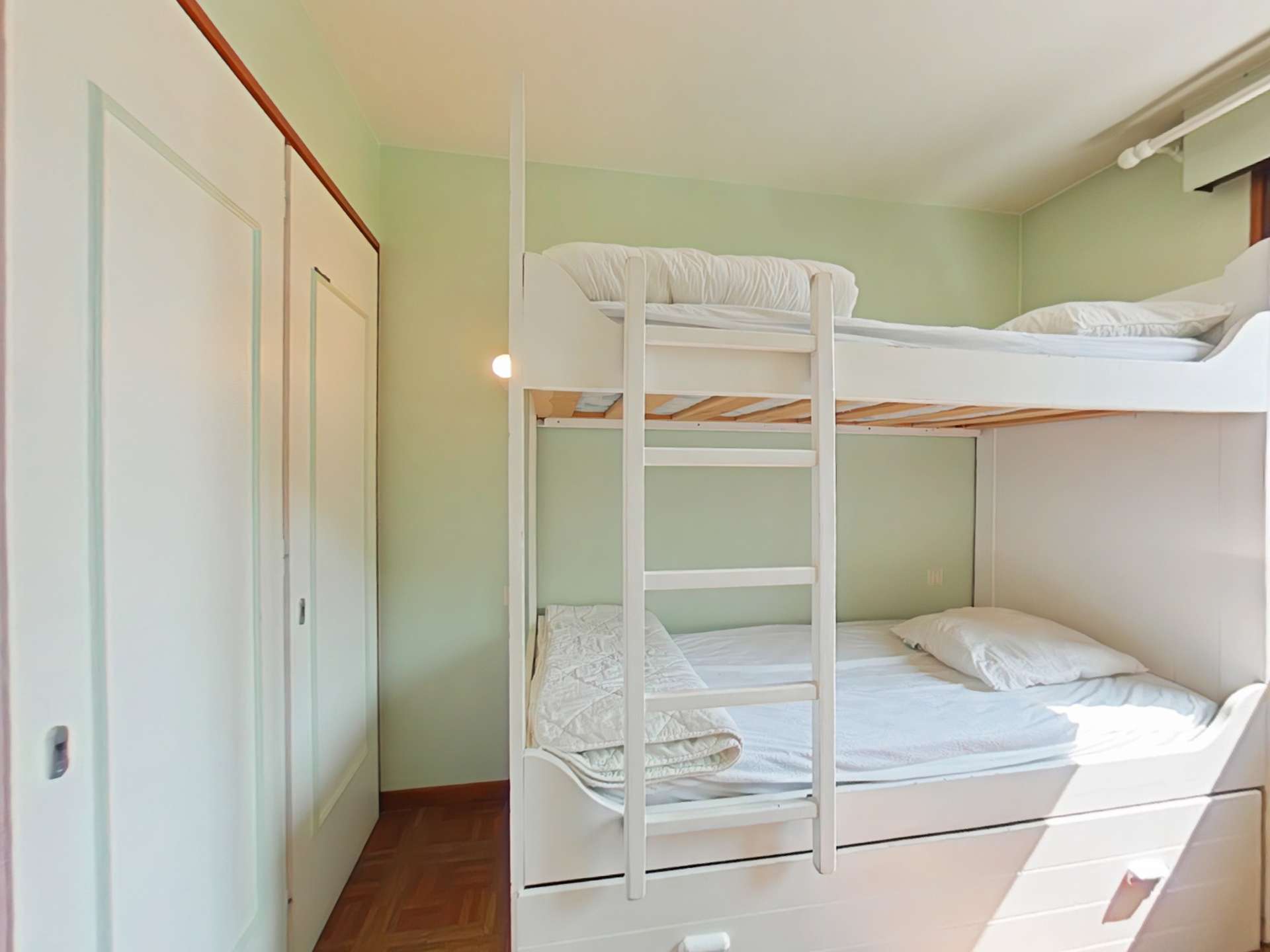 This vacation apartment, located on the 3rd floor with elevator, includes a living room with a sofa bed for 2 people, a television, a kitchenette equipped with a dishwasher, a bedroom with 2 single bunk beds and a sink area. Upstairs, there is a bedroom with a double bed and a sink area, and a bathroom with a washing machine and a built-in toilet.
