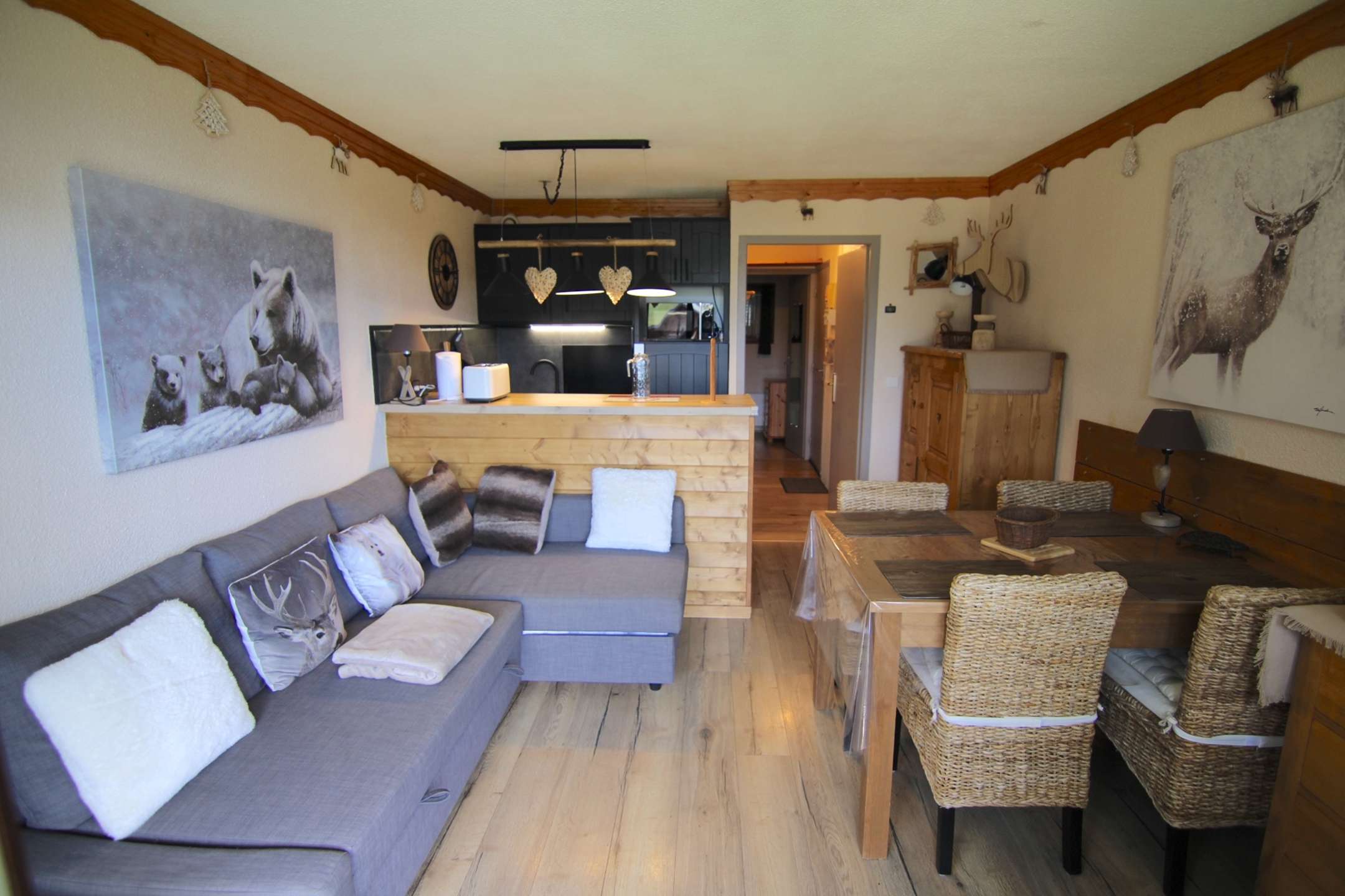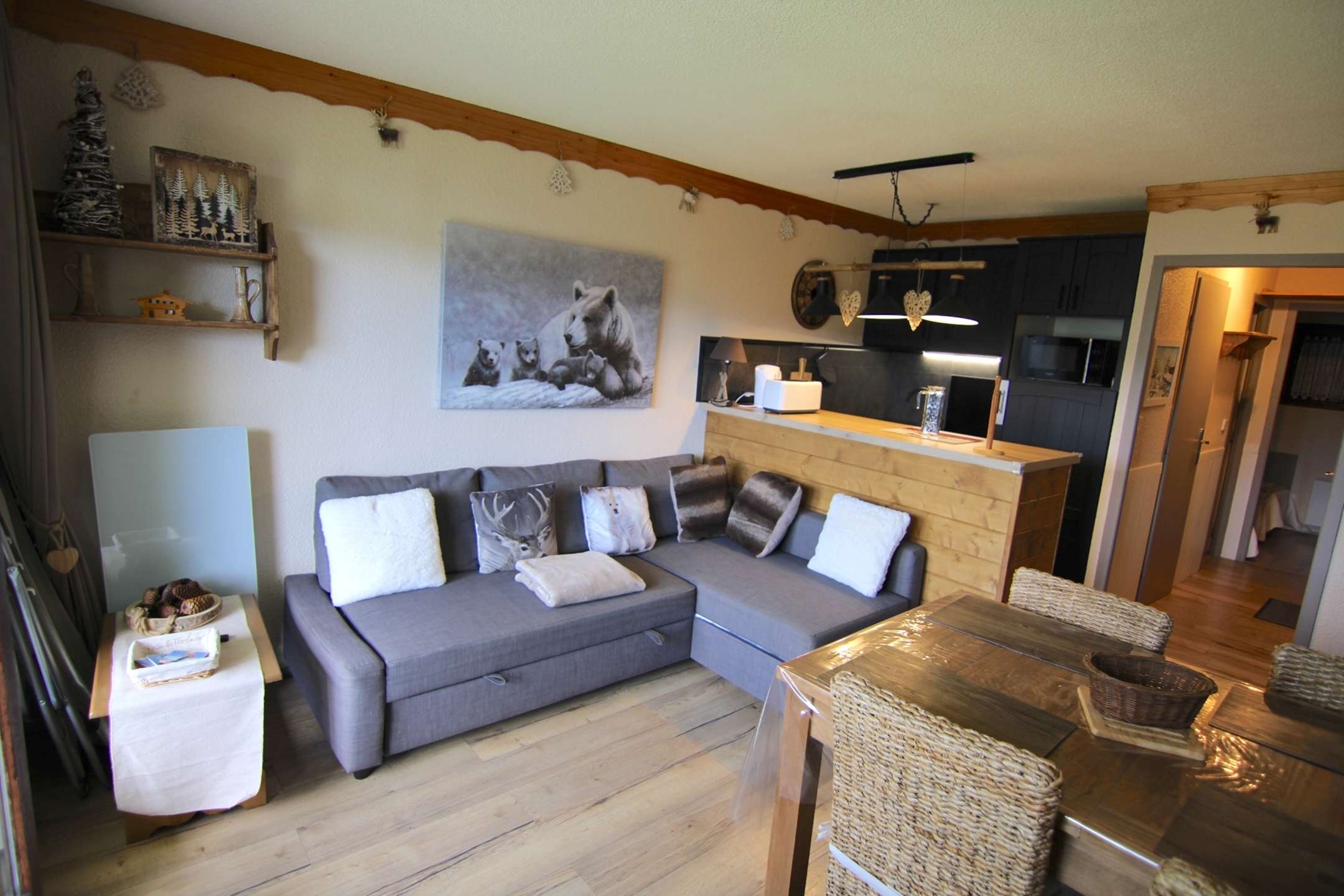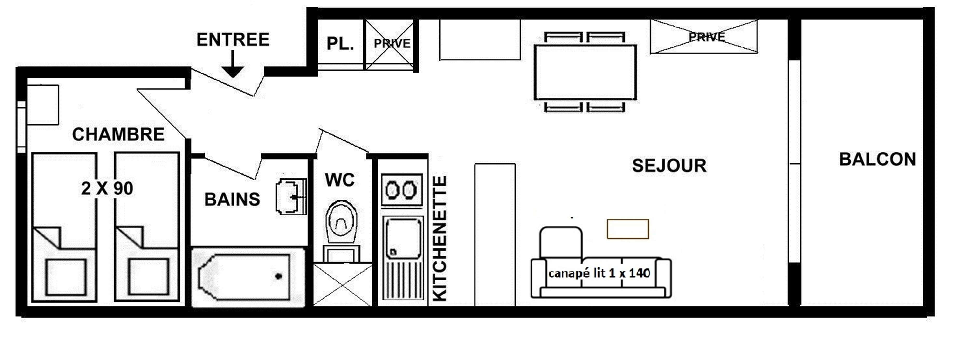 The apartment has a living room with a sofa bed (140cm) and an open-plan fitted kitchenette, a bedroom with two single beds (90cm) side by side, a bathroom and separate WC.