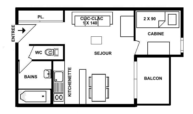 The apartment has a living room with a 140cm sofa bed and an open-plan fitted kitchenette, a cabin with 2x80cm bunk beds (NB: the top bunk is not suitable for children under 6), a bathroom and separate WC.