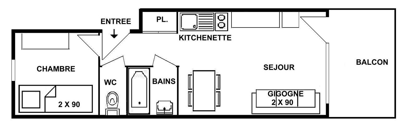 The apartment has a fully-equipped kitchenette, a living room with a 2x90 pull-out sofa, a bedroom with 2x90 bunk beds, a bathroom and a separate toilet.