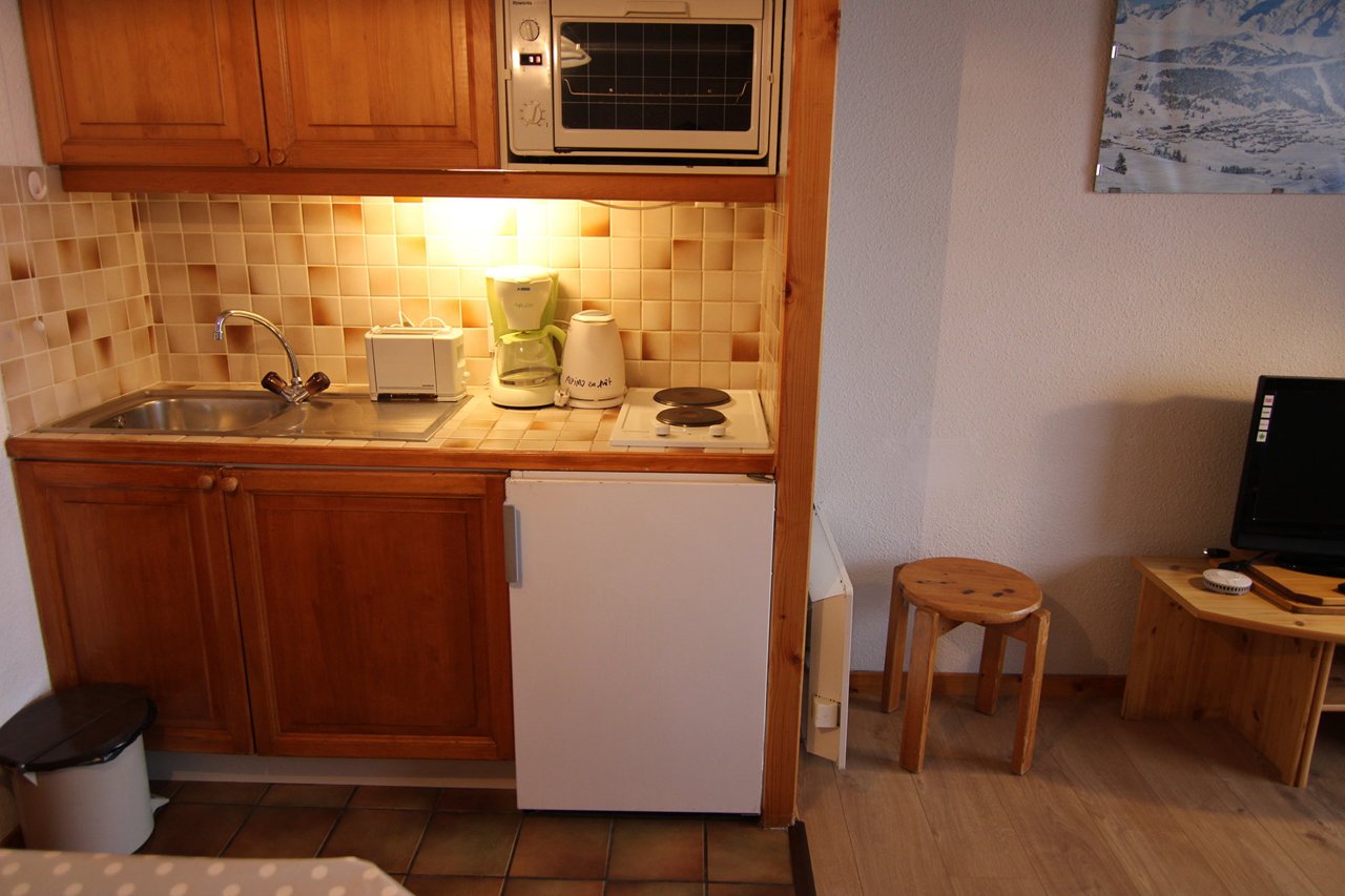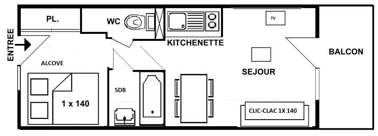 Alcove studio apartment on the first floor of the residence without lift (half a floor outside to climb for access), south-facing with balcony.