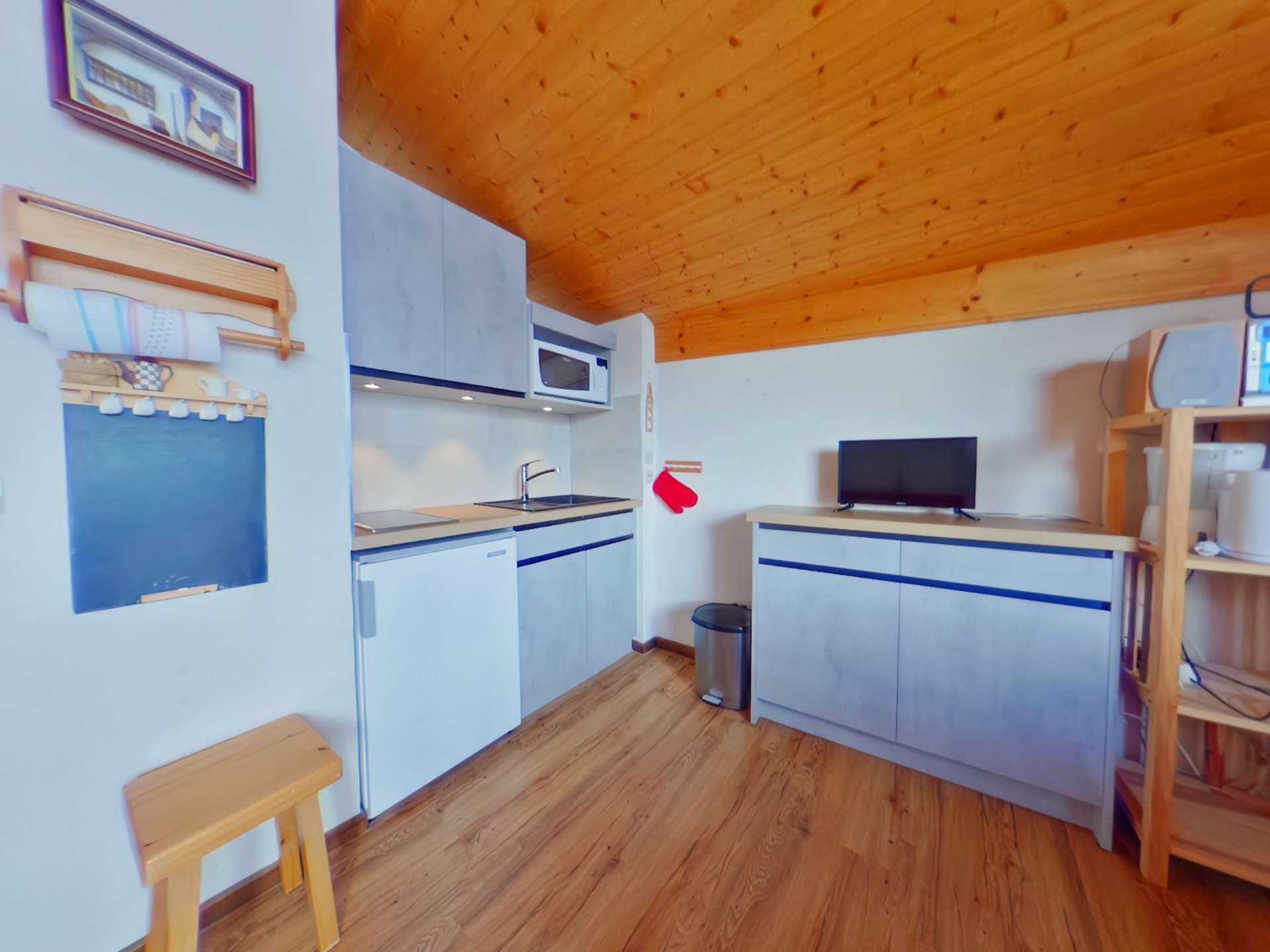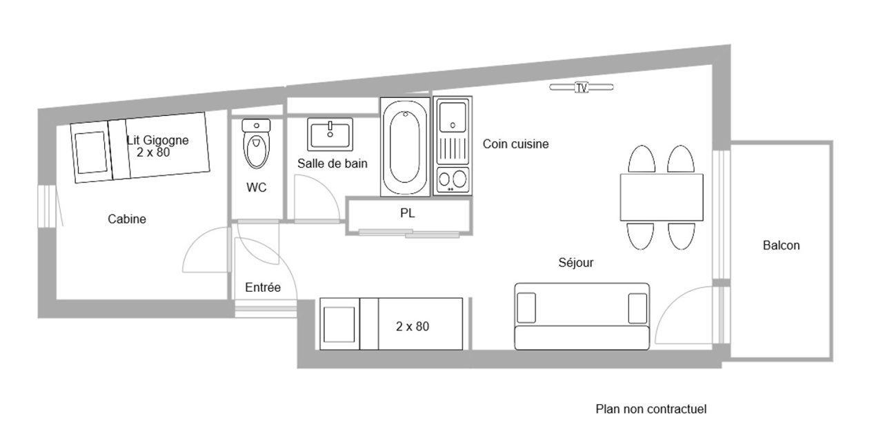 The apartment has a fully-equipped kitchenette, a living room, a bedroom with a 2x80 trundle bed, an alcove with 2 2x80 bunk beds, a bathroom and a separate toilet.