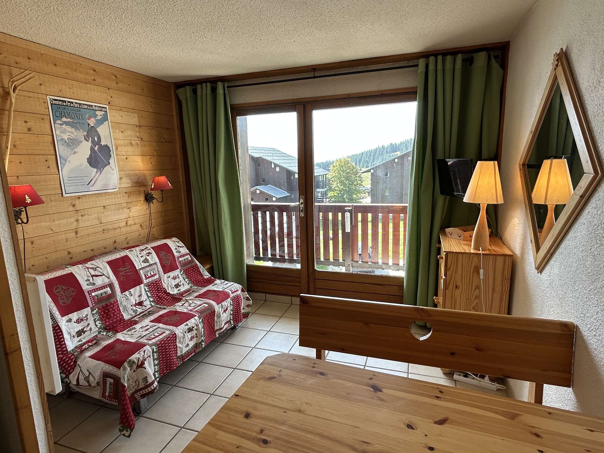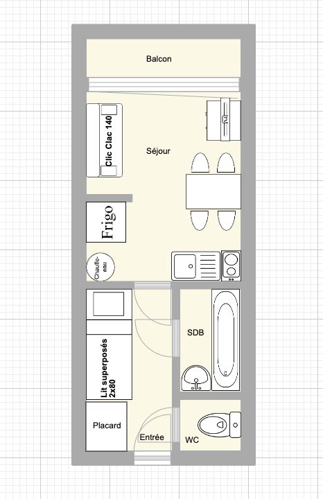 The apartment consists of a living room with a sofa bed and an open-plan equipped kitchenette, an alcove with two bunk beds (Note: the top bunk is prohibited for children under 6 years old), a bathroom, and a separate toilet.