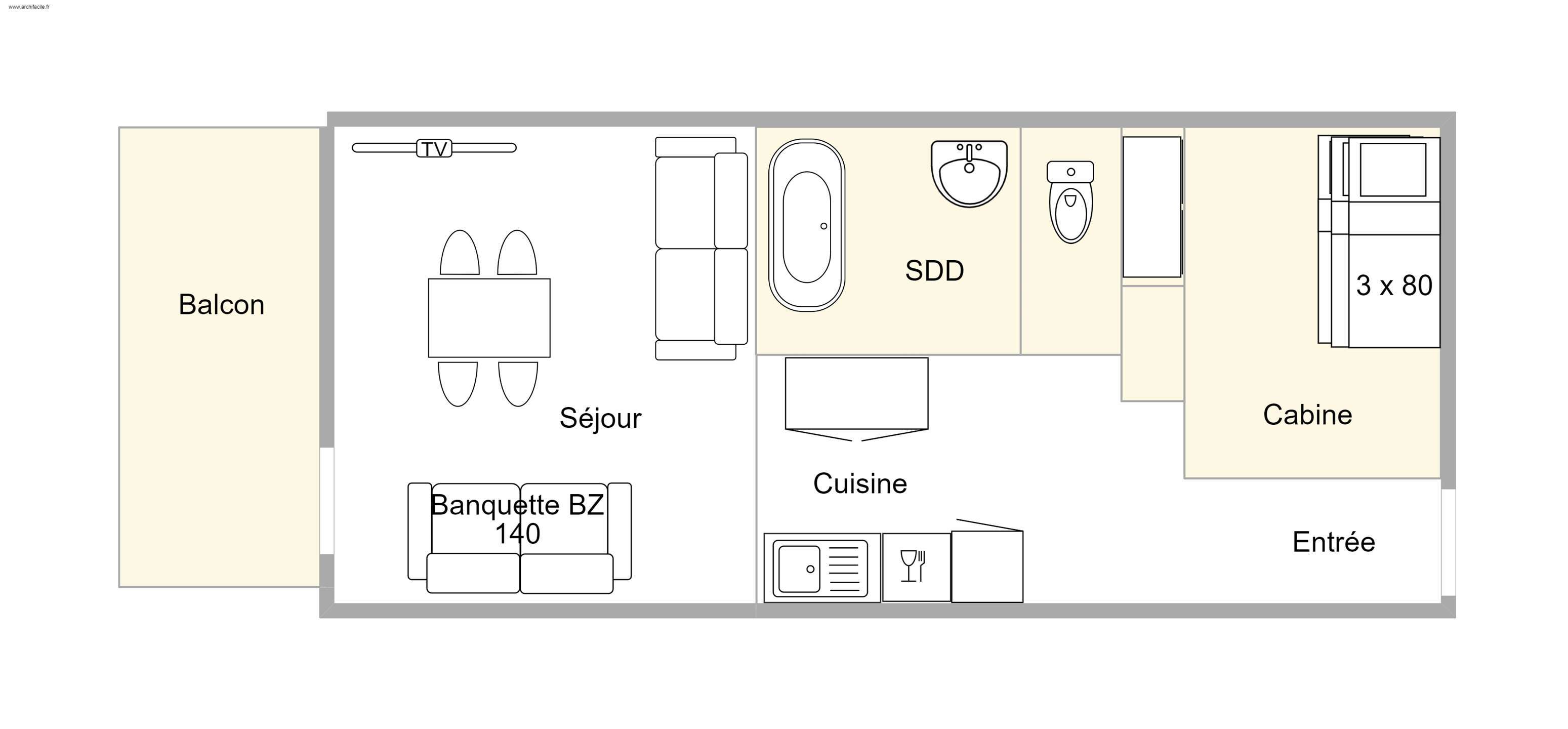 The apartment has a fully-equipped kitchenette, a living room with a 140cm sofa, a cabin with 2x80cm bunk beds plus a 1x80cm pull-out bed and a bathroom with separate toilet (N.B.: the top bunk is not suitable for children under 6).