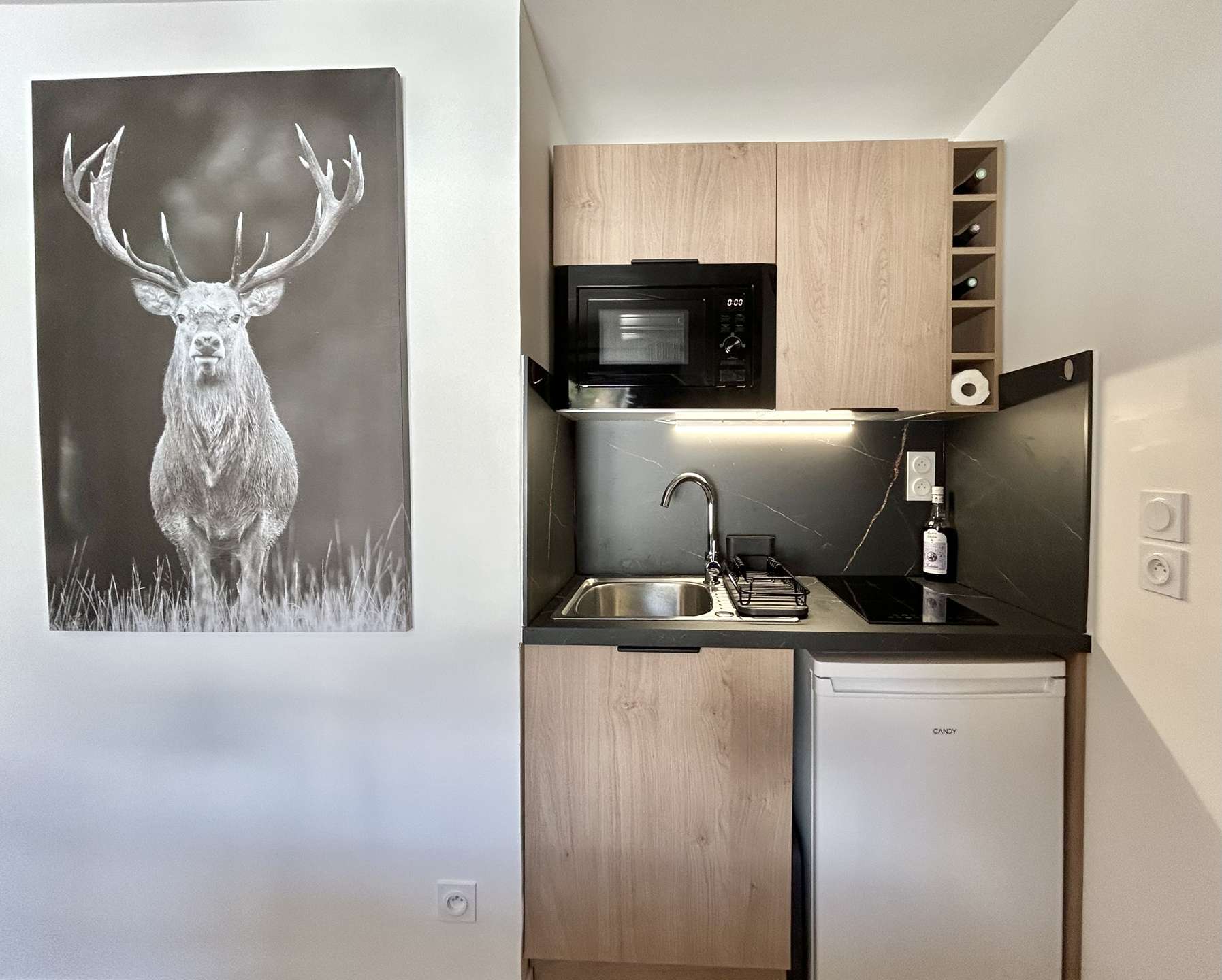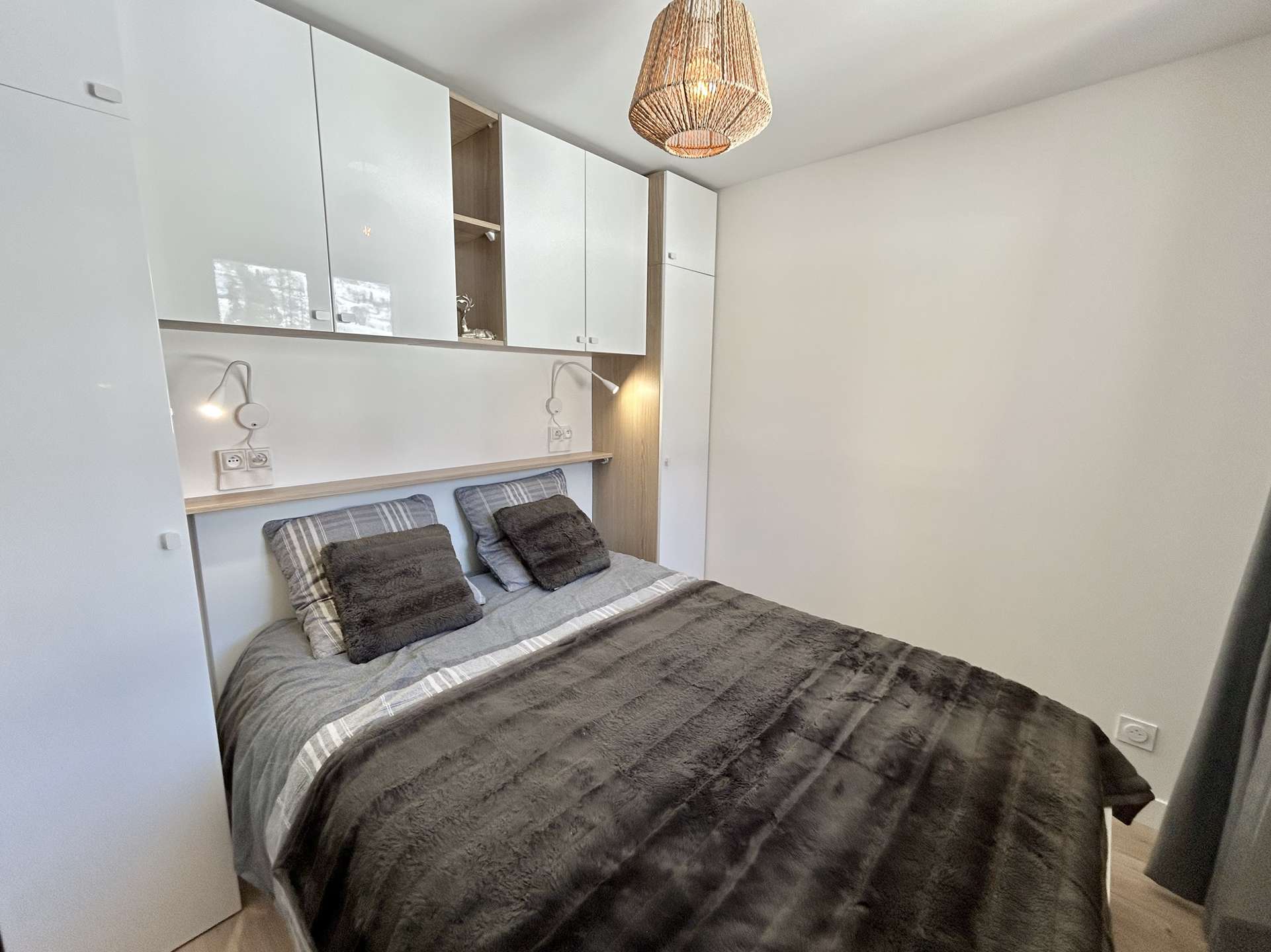 This fully renovated apartment located on level -1 at garden level comprises an entrance hall with a sleeping area featuring 1 bunk bed (sleeps 2 single beds) (80x190) (the top bunk is not suitable for children under 6), a bedroom with a double bed (140x200), a shower room, a separate toilet, and a kitchen opening onto the living room with a sofa, a TV, and access to the west-facing terrace.