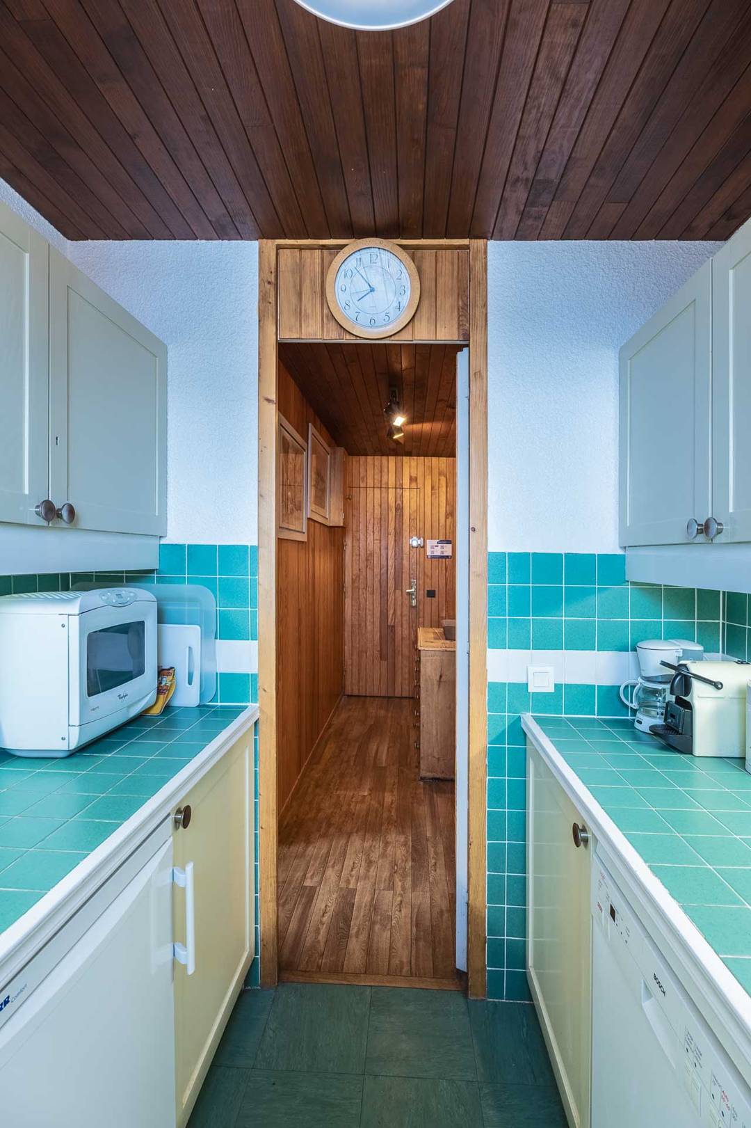 The living room without beds is equipped with a TV. Bedroom with double bed (140x190). Cabin room with a set of bunk beds (90x190). Equipped with electric hob, oven, dishwasher and refrigerator. Bathroom and separate WC. Balcony. Ski locker in the residence. Non-smoking apartment / Pets forbidden.